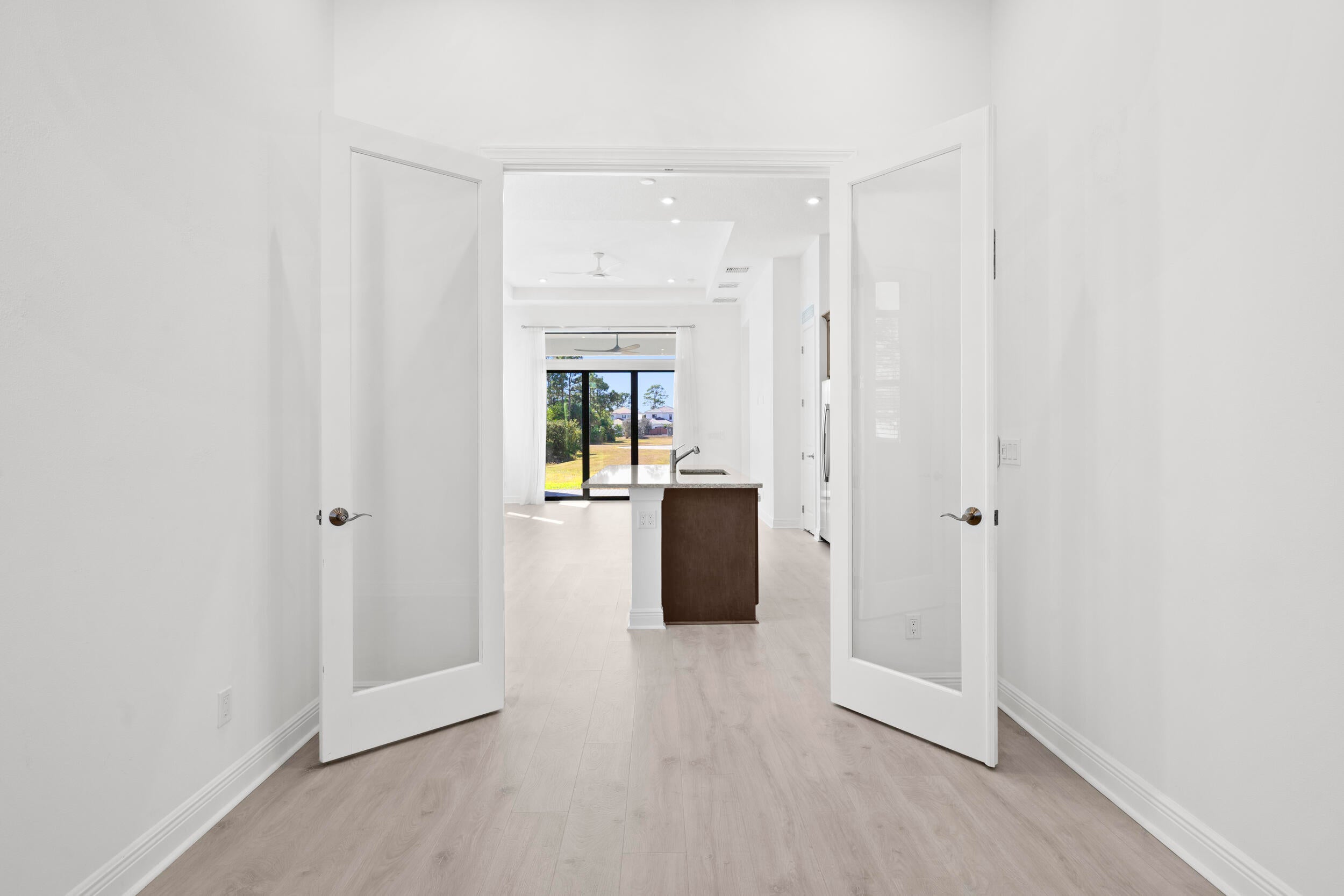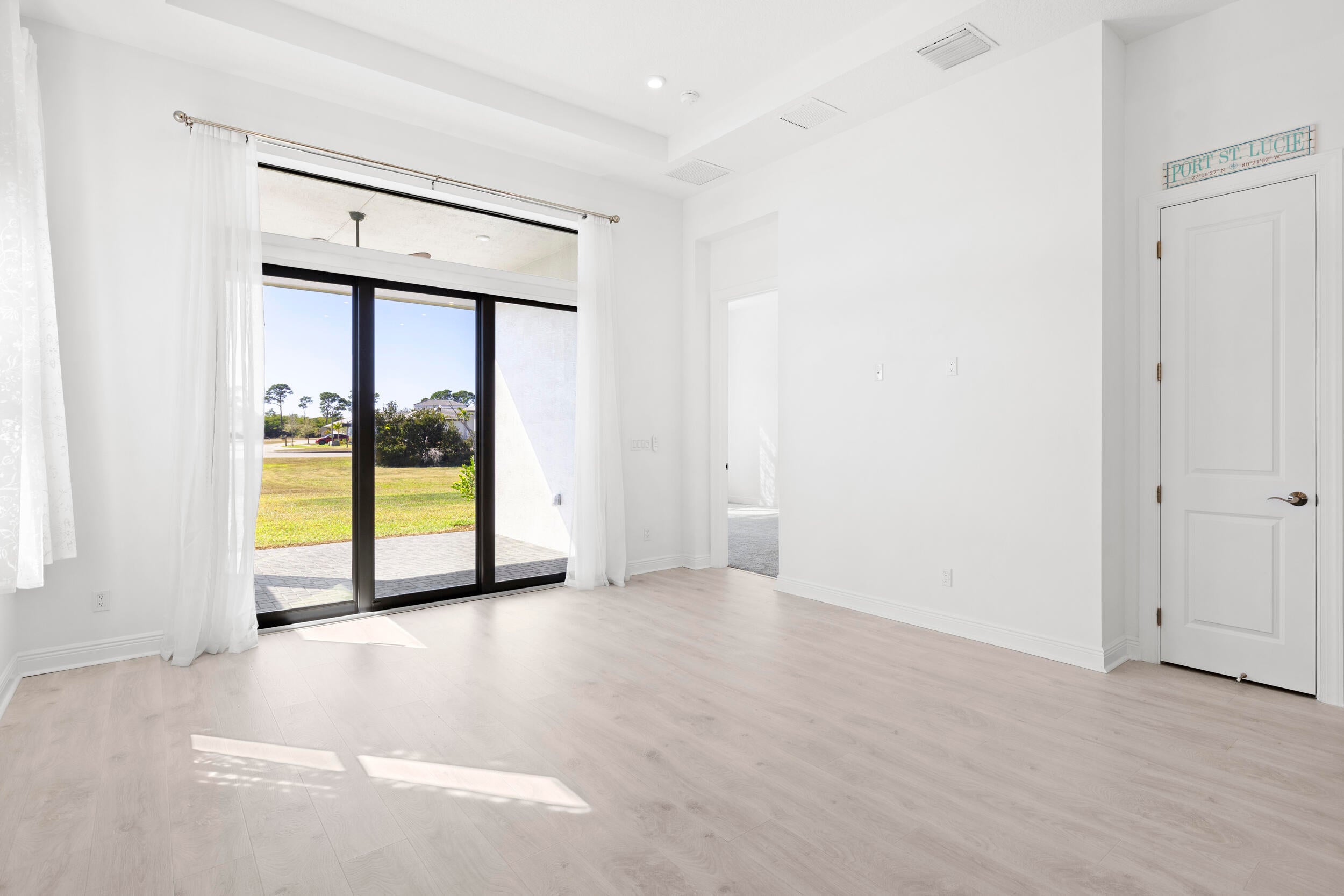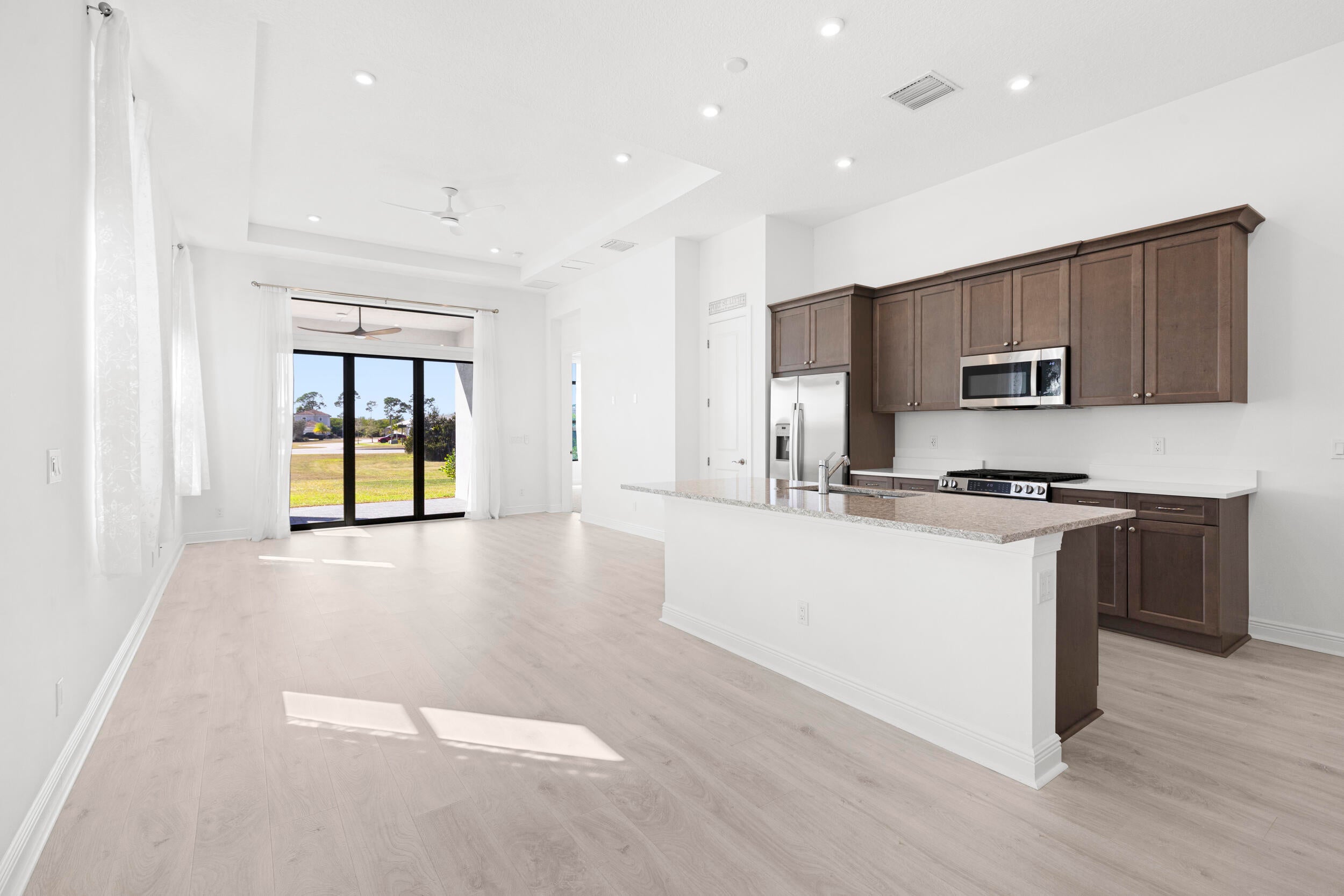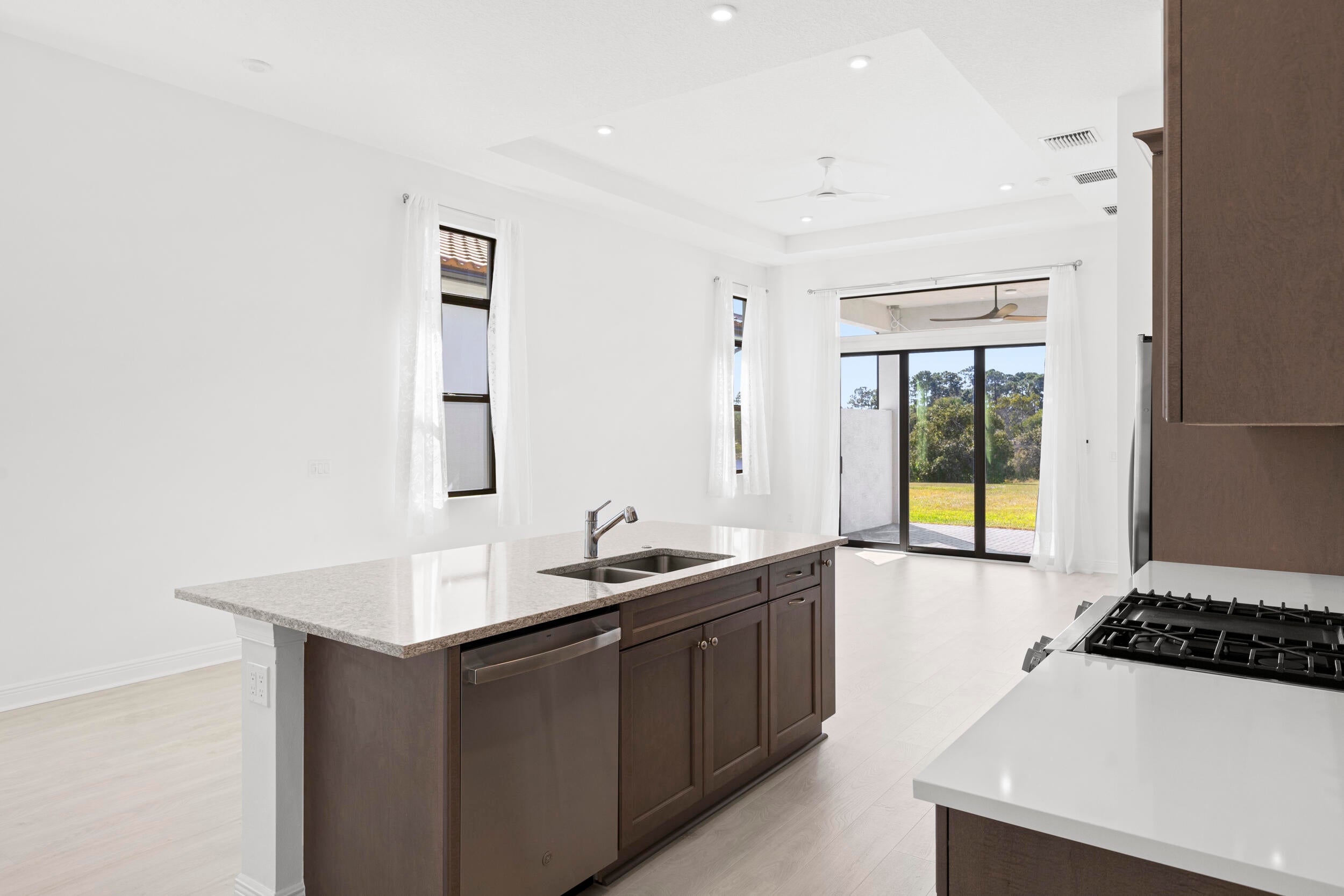 Wind down with serene sunset lake views from the back patio of this stunning 2025-built home in Rivella. This 2-bedroom + den, 2-bath residence features quartz countertops in the kitchen and baths, electric shades, and no neighbors directly behind for added privacy. Stroll the trails, play tennis, relax at the pool, or gather at the clubhouse. With the new Port District, beaches, golf, and boating all nearby, every day feels like a vacation. Available Now!