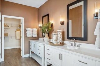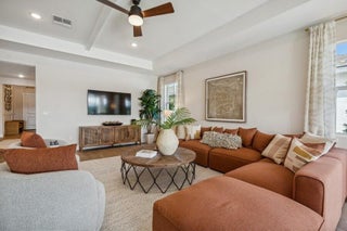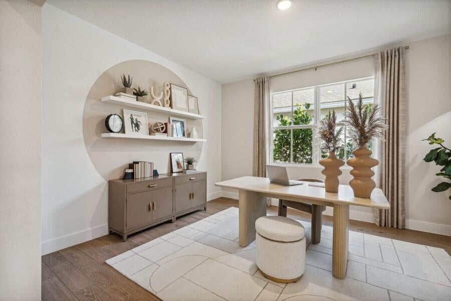 This Kelly model offers stunning water views and a serene backdrop for everyday living. Showcasing a designer-curated Loft look, the home features porcelain wood-look tile throughout and an elegant chef's kitchen with white cabinetry, Statuary Classic quartz countertops, a large island, and a spacious pantry--perfect for entertaining. The spacious great room includes sliding doors that open to a beautiful covered patio, creating seamless indoor-outdoor living. A private home office provides a quiet space for working from home. The luxurious primary suite features triple windows that fill the space with natural light, while the relaxing primary bath offers a spacious shower and walk-in closet. The covered patio is ideal for outdoor entertaining while enjoying peaceful lake views.