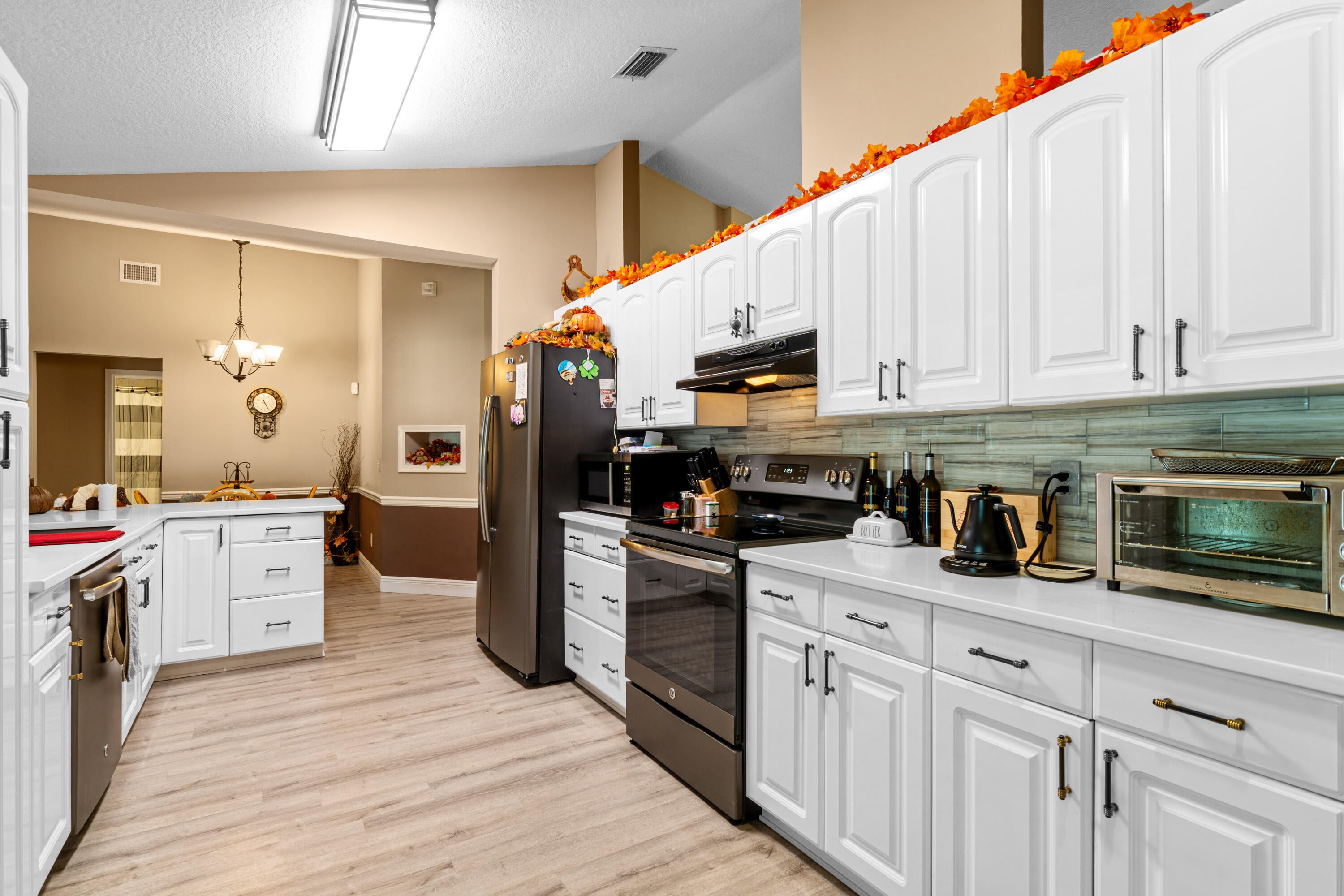 Make this your new home!!! With an open concept area between kitchen, dining and family area, along with an ample size area that could be a formal dining room, den or presently a game room. Many updates performed over the years, making this a very warm and inviting home. In 2021, Impacted Windows were installed, custom wood windowsills at each window, home beautifully stuccoed and painted with premium materials, AC and Hot Water Heater were replaced, and Laminate Flooring throughout the entire home. In 2023, New Roof along with aluminum soffit, gutters, solar vent (for energy conservation), White Vinyl Fencing with oversized gates on each side of home were installed, back fencing is a 6 foot chain link boasting a beautiful Night Jasmine Hedge allowing privacy and landscape.Resurfaced Fiberglass Pool with new pump and filter canister. Child Safety Fence is available for the possibility of young children and pool safety. Pet friendly area on side of home, giving everyone a place. In 2025, new Quartz kitchen countertops and under mount sink in the expanded Galley Kitchen installed. Beautiful knockdown ceilings throughout the home. New Quartz countertops in the master bathroom. Designer cabinet and Mirror. Rain Head Shower. Second Bath remodeled in 2023. Smart Outdoor Outlets for seasonal lighting. Pull down Stairs for easy Attic access. Great location, near I95 and Fl Turnpike. Publix 5 minutes away, 10 minutes to Tradition and nearby Hospital.