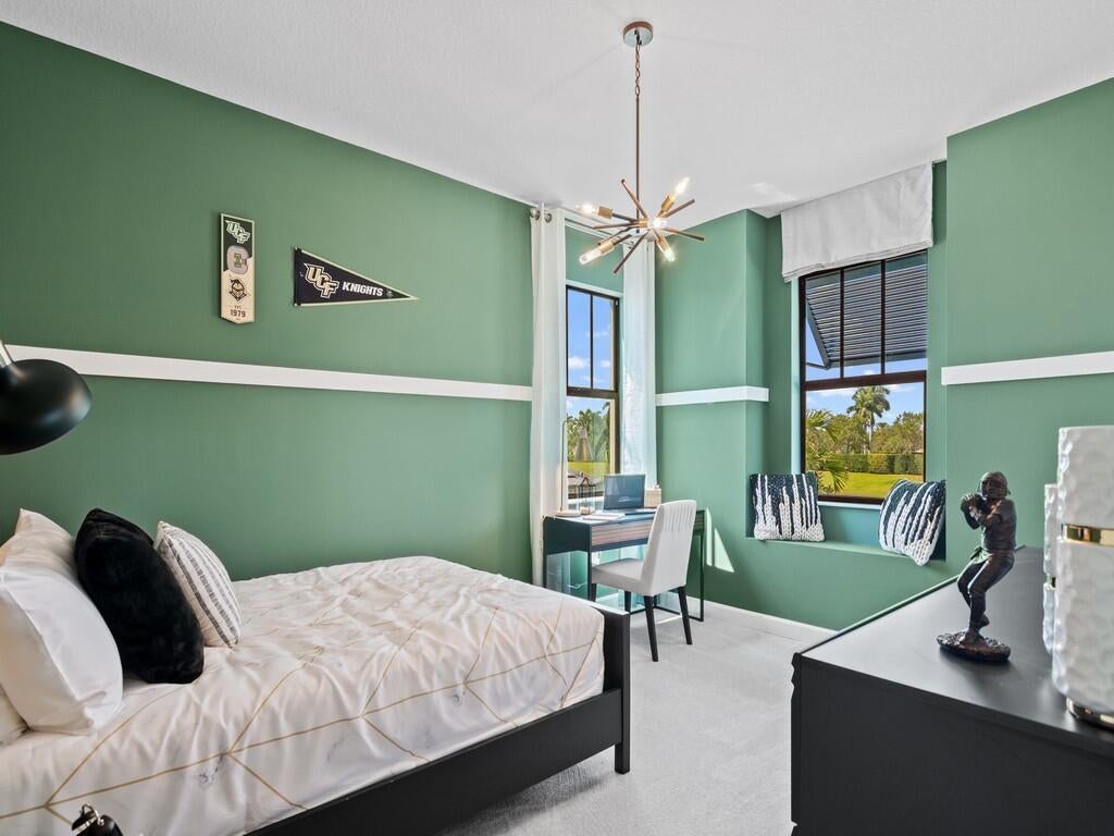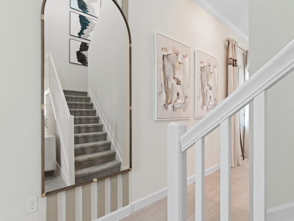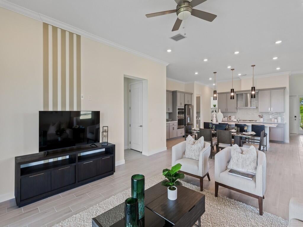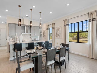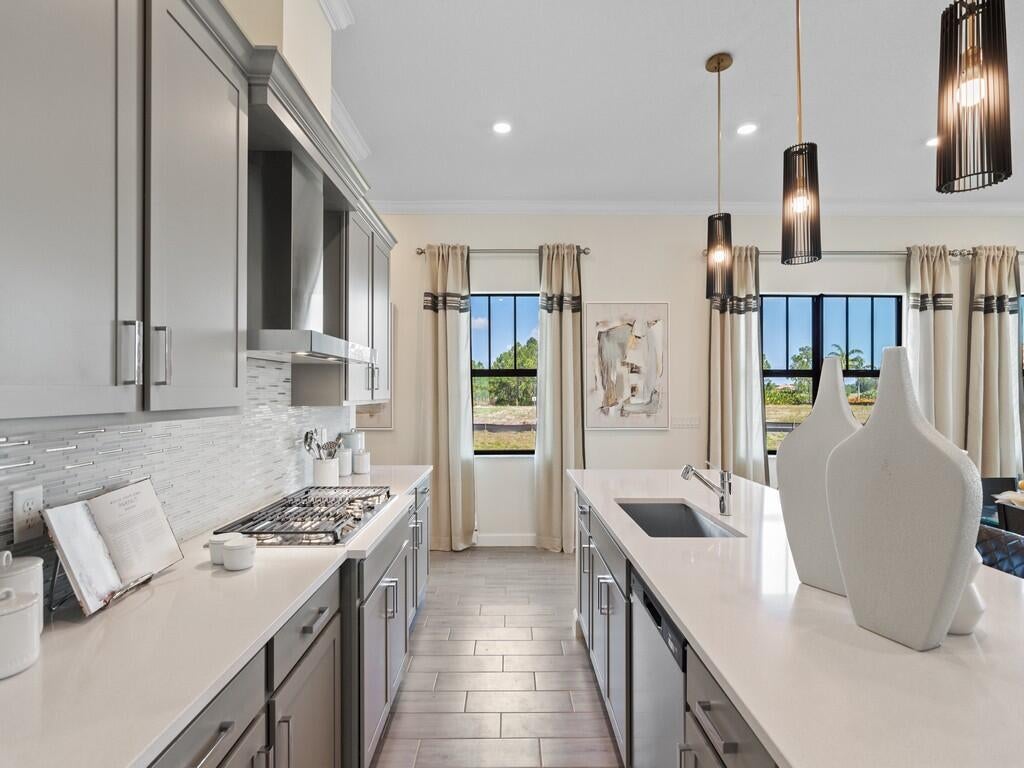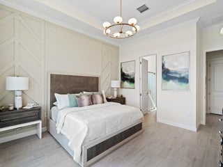 This two-story home combines modern comfort with style. To the side of the foyer is a flex space well-suited as an office, while down the hallway is a cohesive open layout with a covered terrace to deliver seamless living and entertaining. The tranquil owner's suite with en-suite bathroom is tucked into the back corner on the first floor, affording homeowners privacy away from the remaining upstairs bedrooms. The top level hosts a large loft that can function as another gathering area and three bedrooms. Tesoro Club is manned and gated with roving patrol and has incredible onsite amenities including two clubhouses, a golf course and luxe, resort-inspired swimming pools. Photos are for illustrative purposes only.