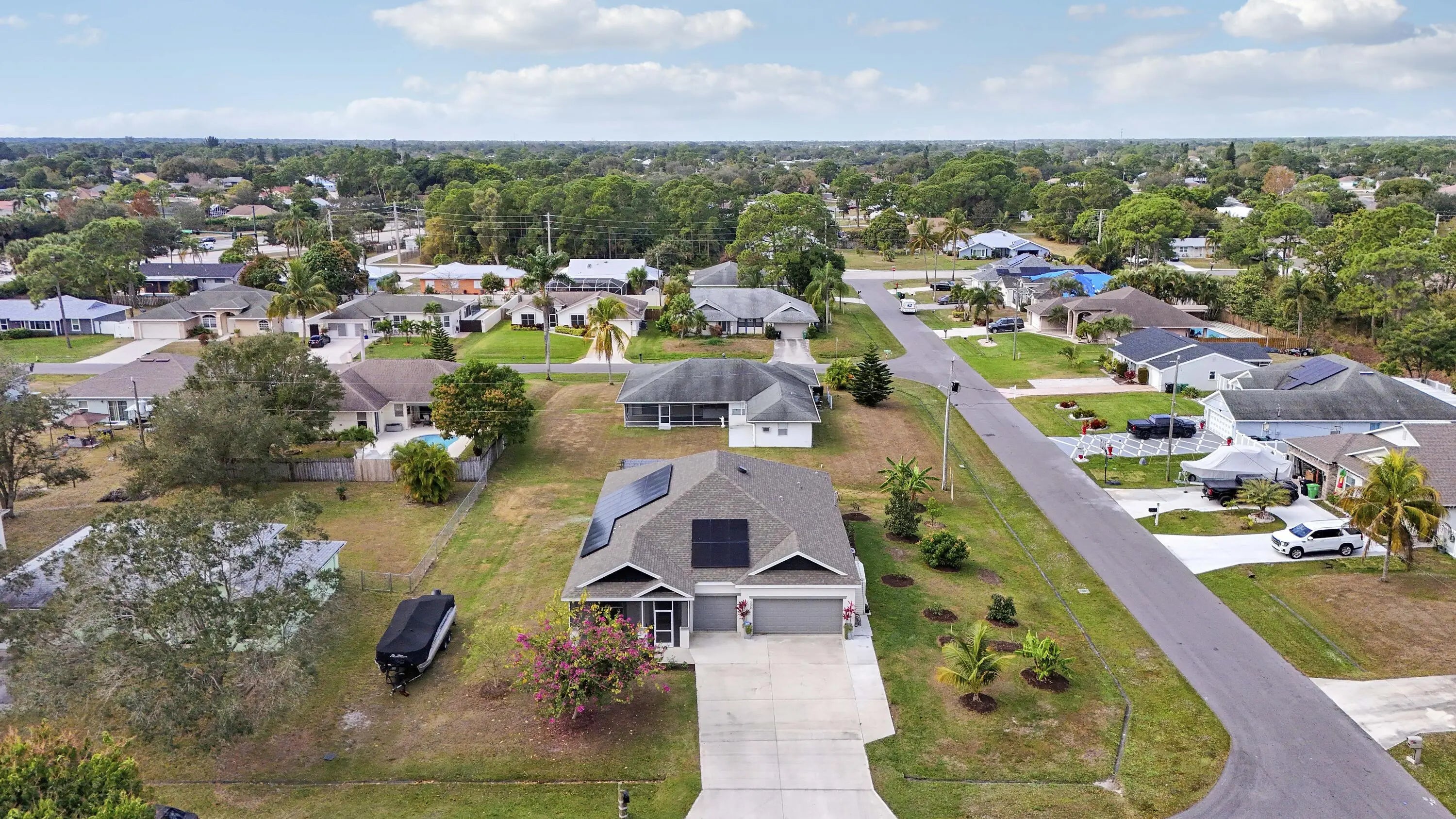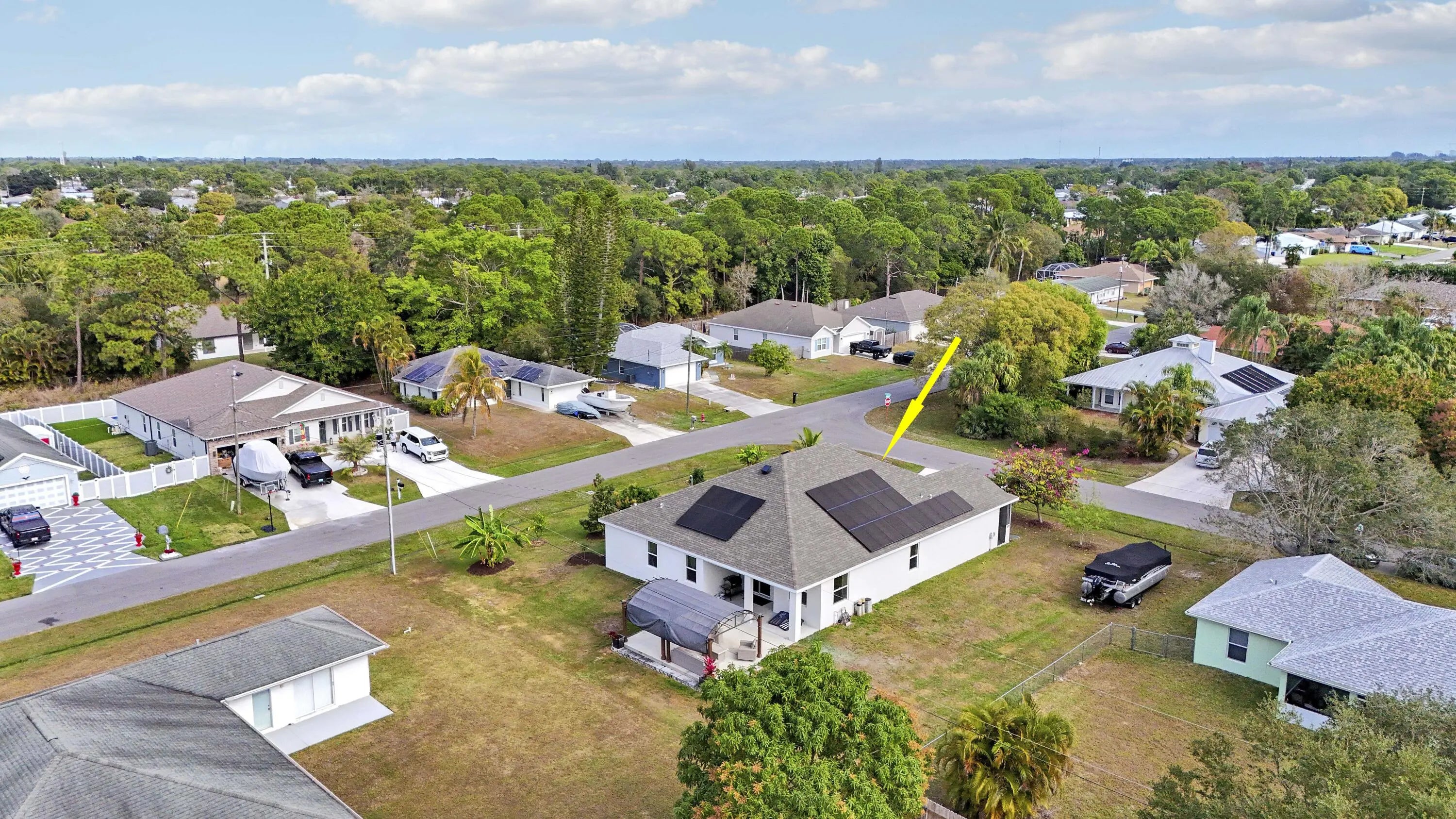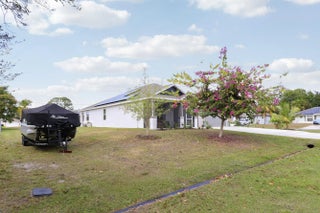 BETTER THAN NEW CONSTRUCTION 2022 CBS ESTATE--$63k SOLAR PAID BY SELLER! Enjoy ~$36/mo electric bills! Skip the builder basics; this freshly painted 4 Bed + Den/3 Bath/3-Car Garage home offers tons upgrades you won't get with new construction. Key value-adds: Whole-home water softener/filtration, screened front entry, & custom shelving in the pantry, laundry & garage. The open kitchen features 42'' cabinets with a massive granite island. Step out to an extended 22'x20' pergola-shaded patio surrounded by a mature fruit grove (Mango, Avocado, Citrus, Pineapple, Banana ). Premium corner lot offers Boat/RV access potential from either side. Complete hurricane protection, garage workshop, ADT Security, Nest thermostat & LifeProof flooring included. Low insurance & move-in ready