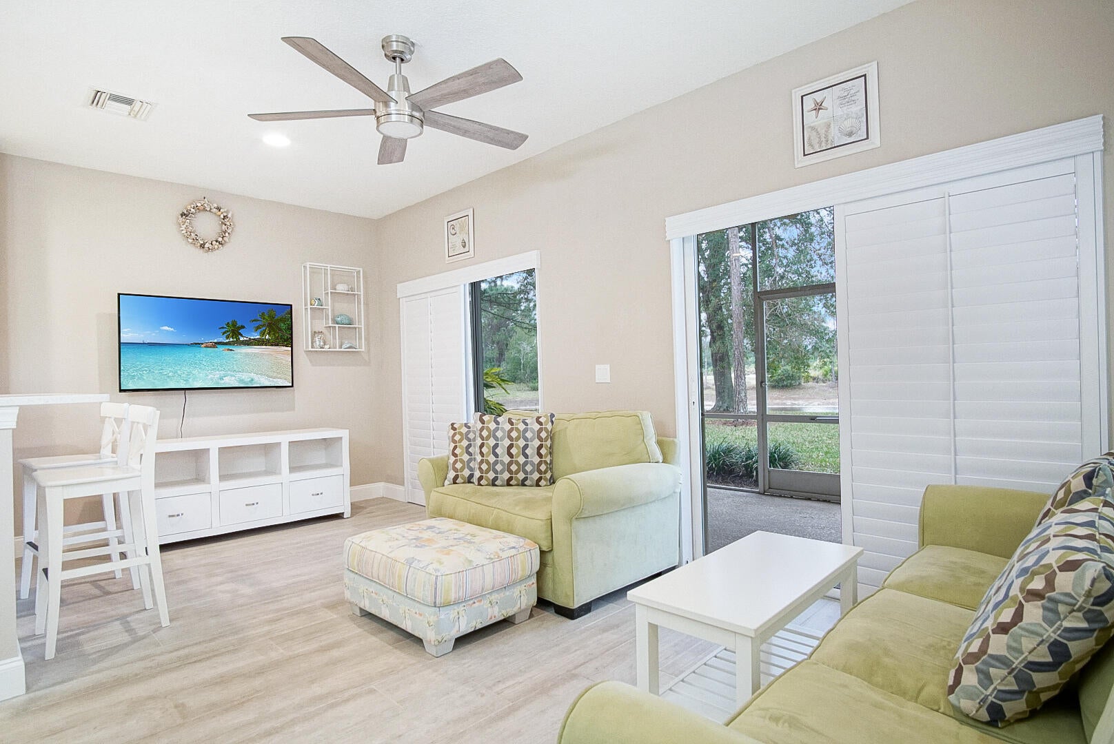 Golf course views, a waterfront lot, and two seperate units all in one property! Unit A offers a beautiful kitchen with stainless steel appliances, two tiered quartz countertops, a stylish tile backsplash, and white cabinets with crown molding. The family room offers stunning views of the world renowned PGA Golf Club, and you can step outside for a more intimate expereince in your fully screened and covered private back patio. The gorgeous plank tile flooring continues into the master suite, and you'll love the tastefully tiled master bathroom shower with seating space and a double-sink vanity for convenience. Unit B offers an efficiency for guests, added space, or rental opportunities. All windows and one slider are PGT impact rated, and you'll appreciate the added security of accordionshutters. Smart features include a front load washer and dryer, thermostat, and ceiling fans. Castle Pines is located in St Lucie West, putting you right in the heart of endless great restaurants and entertainment. And if you feel like staying closer to home, the community boasts an oversized outdoor pool with spa, fitness center, tennis courts, basketball court, and billiards tables. This is a rare find in a highly sought after community!