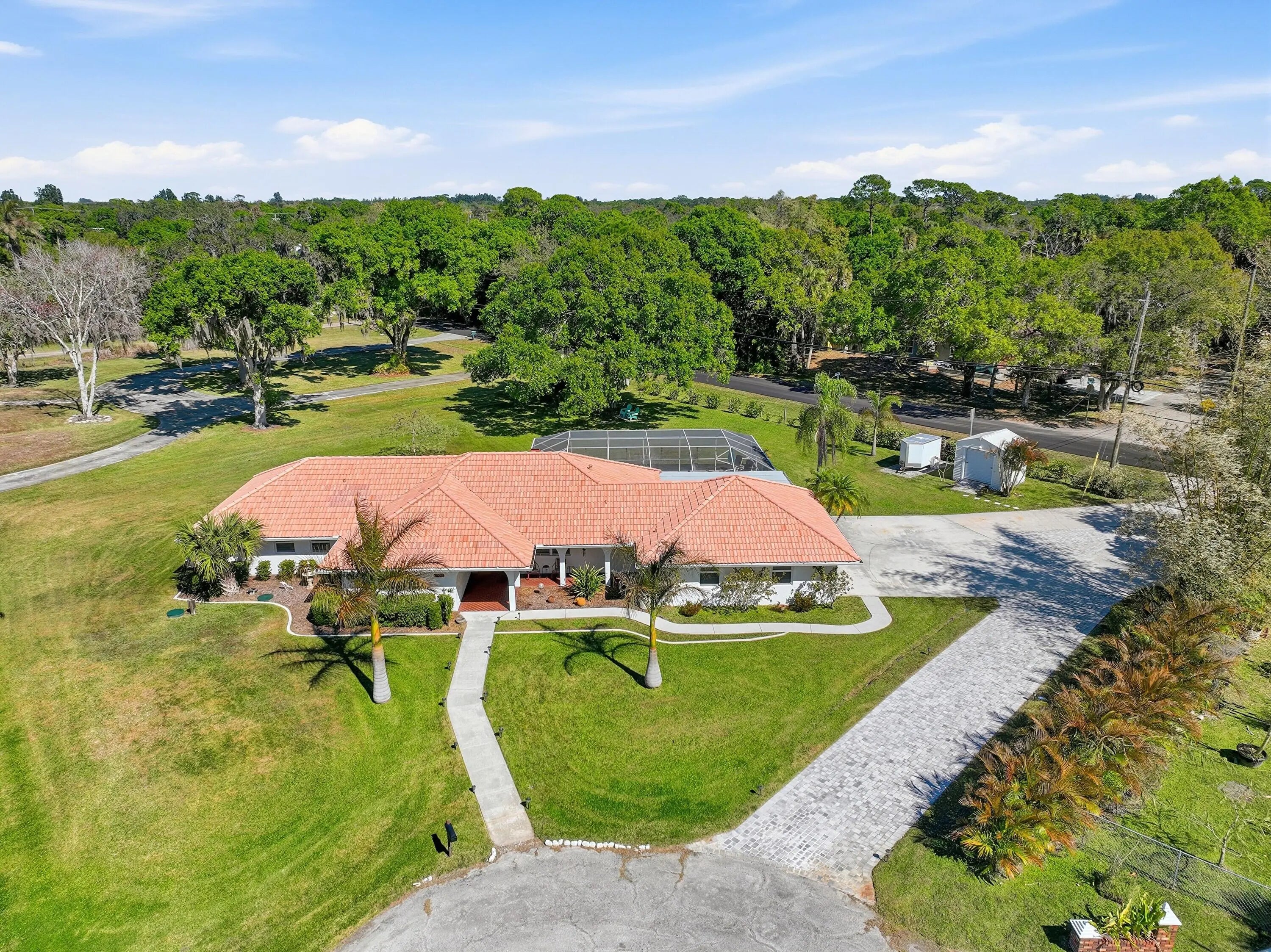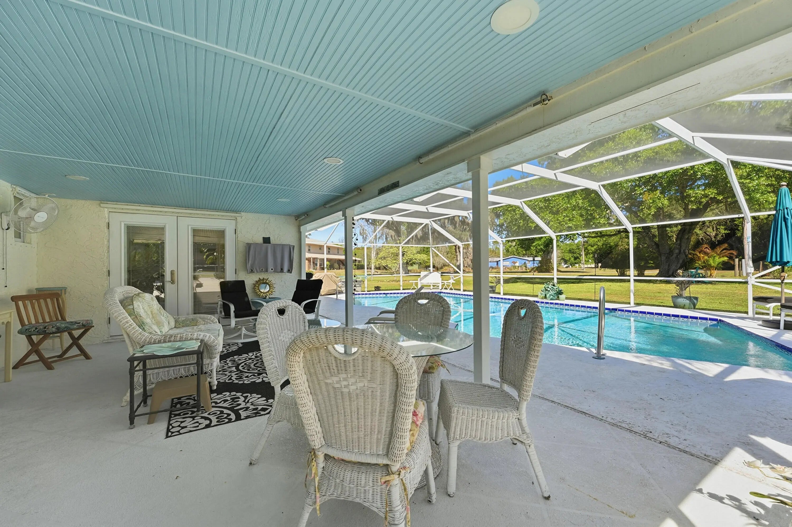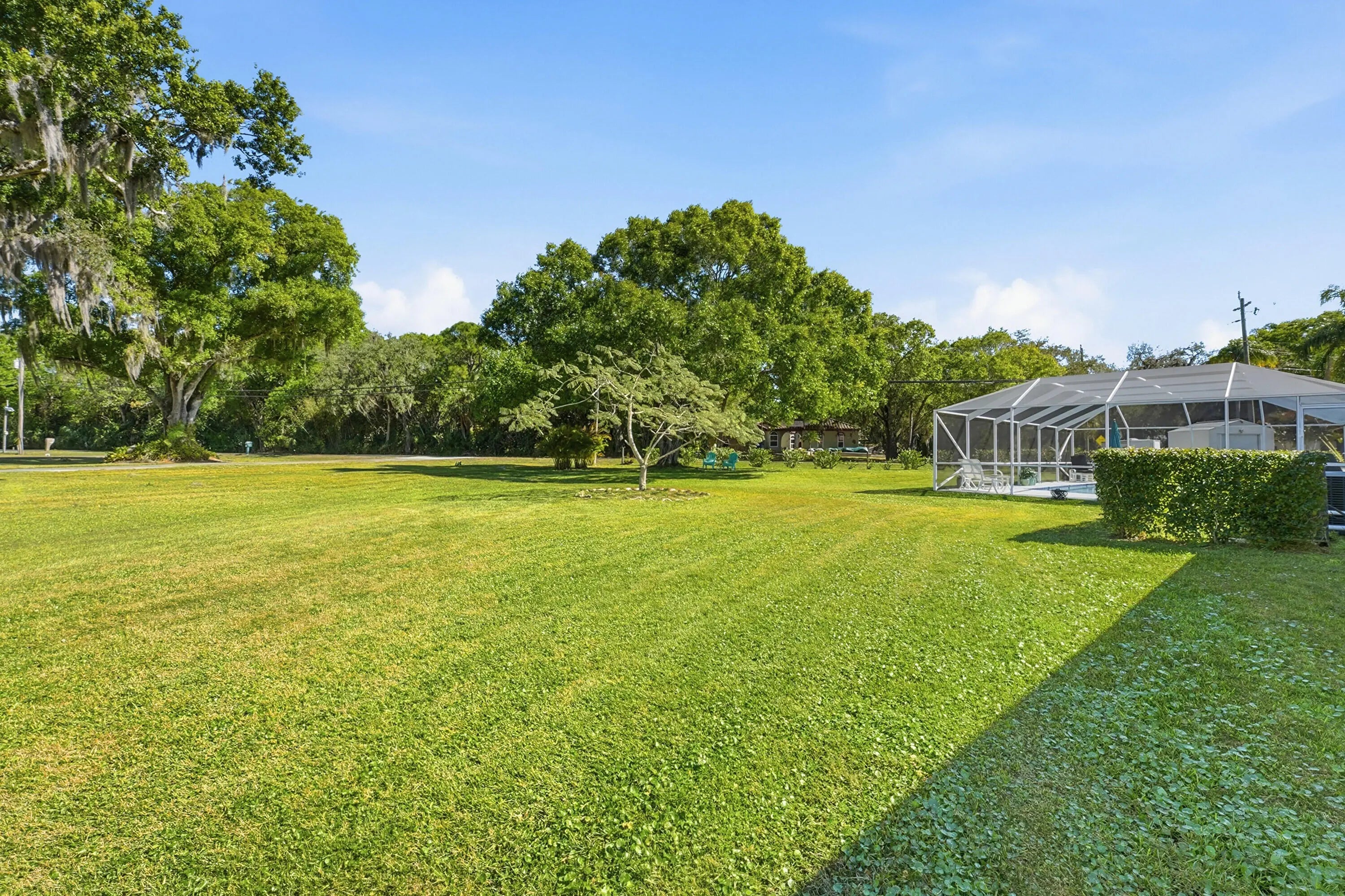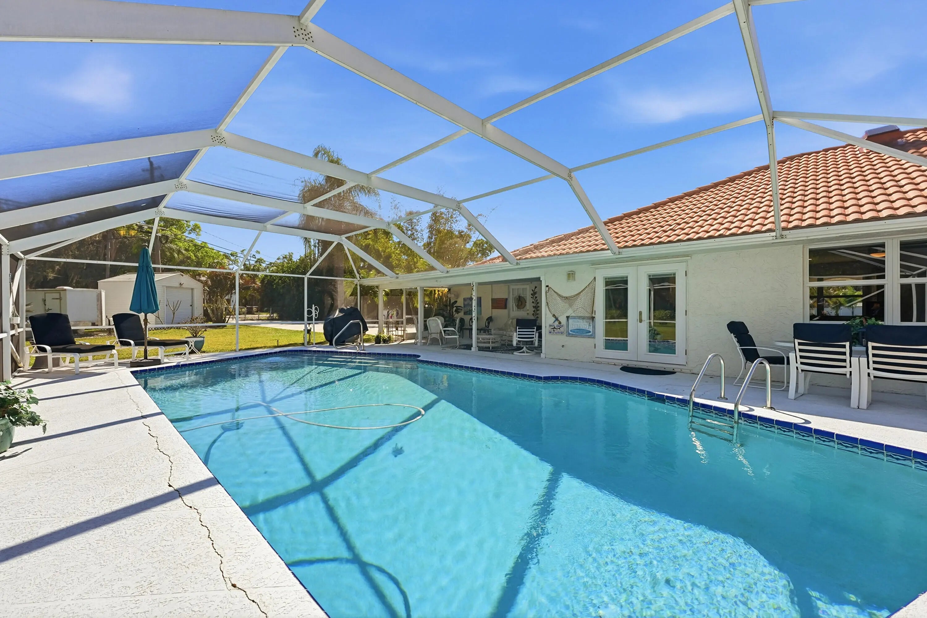 Located on a quiet cul-de-sac, this 3-bedroom, 3-bath home sits on a spacious .62-acre lot and offers extensive upgrades throughout. Key highlights include impact-rated doors and windows, an updated primary bathroom, removed popcorn ceilings, new baseboards, LED lighting, ceiling fans, and a tankless-style water heater for the bedroom baths. The true two-car garage features added lighting, cabinetry, attic access, and flexibility for future expansion.Outdoor living shines with a covered patio (2025), new decking with LED lighting, a screened pool with upgraded pump, filter, plumbing, and high-efficiency electric heater, plus hurricane shutters for the updated French doors. Additional features include an approx. 84' paver driveway with RV parking, extra 50 amps for RV hook up, permitted
