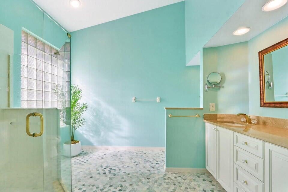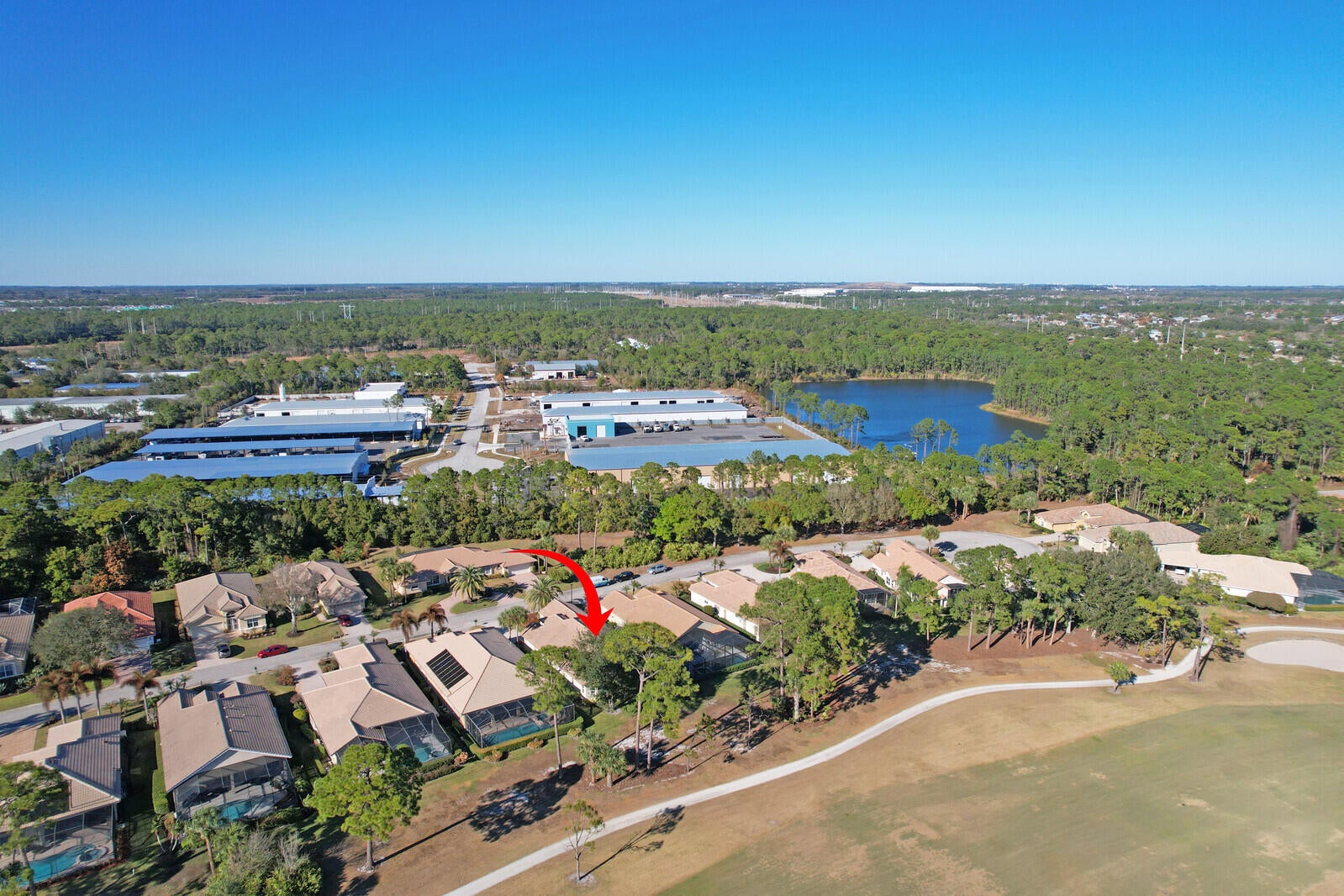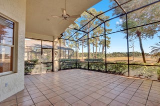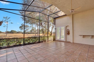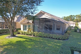 SWEEPING, EXPANSIVE GOLF & WATER VIEW in PGA Village! Meticulously maintained 2 br + den, 2 bath home with 2 car + GOLF CART GARAGE!!! This open floor plan has spacious rooms, high vaulted ceilings & lots of natural light. The sellers took great care to make sure this special home is SPOTLESS & move in ready. Original finishes but well maintained and priced with remodeling in mind. The appliances, wine cooler & water heater are newer, a/c in in 2024. The sweeping views of the Legacy Golf Course from the extended, screened patio are BREATHTAKING! PGA Village is a golfer's delight with 3 world class PGA golf courses, The Legacy, a private golf & tennis club & The Island Club with pool, fitness, tennis, pickle ball & a full calendar of events & activities!