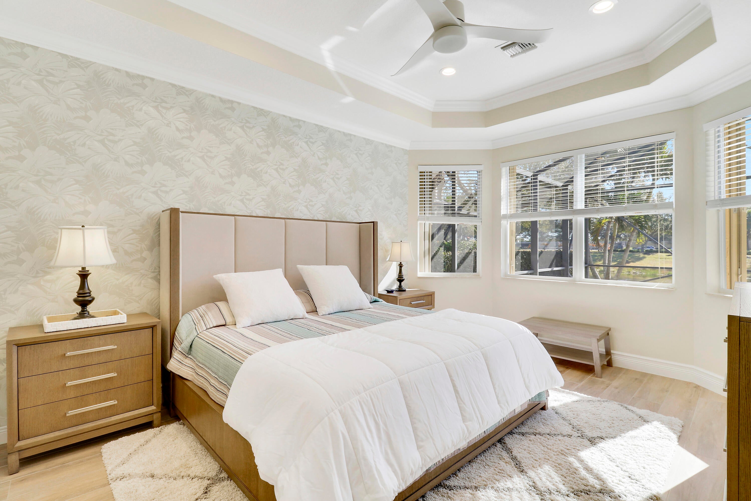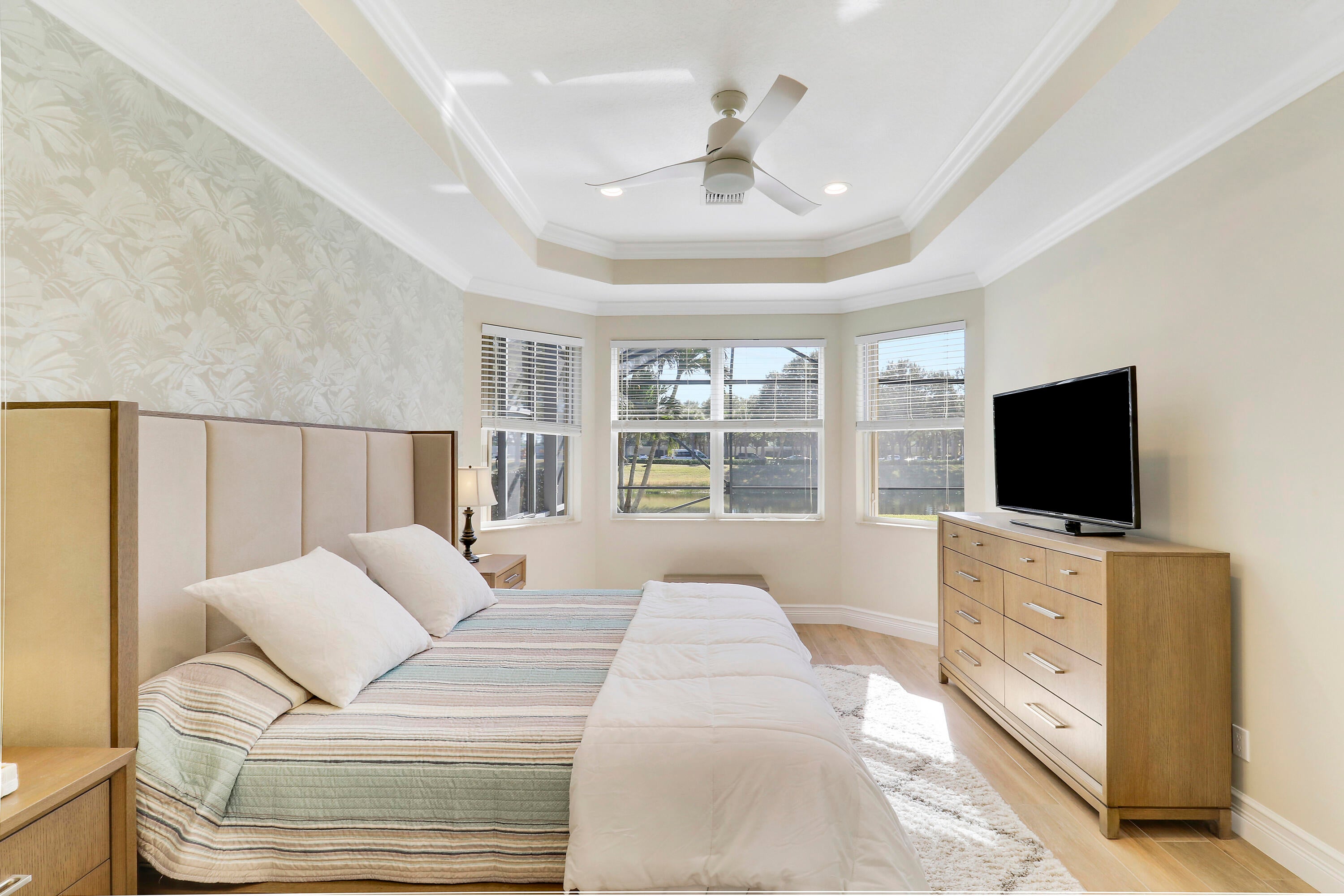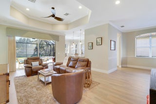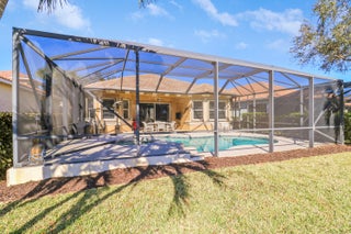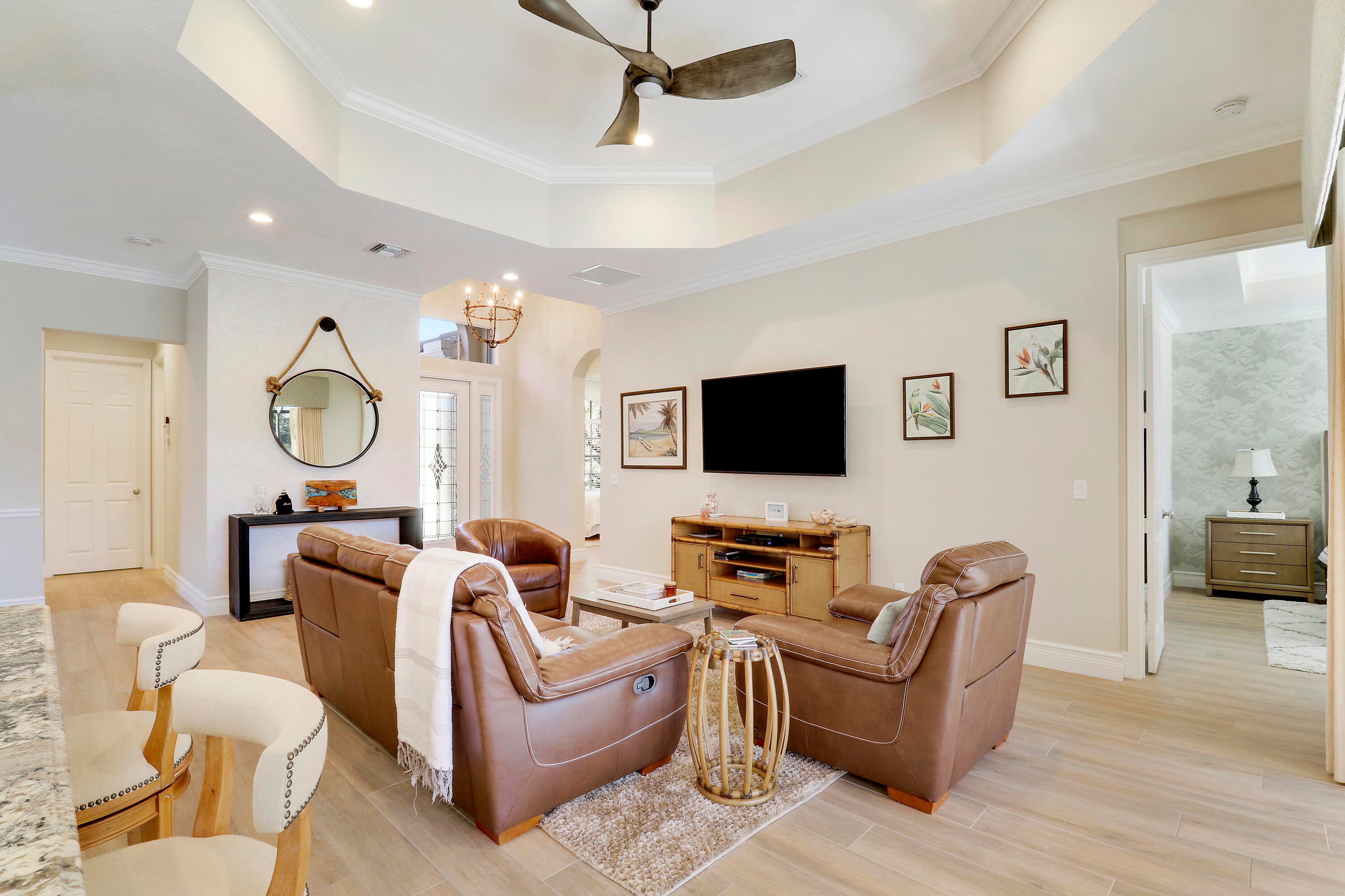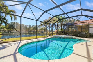 BEAUTIFULLY UPDATED POOL & SPA HOME IN PGA VILLAGE WITH LAKE VIEWS! Move right into this 3BR/2BA/2CG home just steps from the clubhouse. Remodeled in 2017, you will notice the elegant upgrades the moment you walk through the front door with wood look tile flooring t/o, newer baseboards, designer lighting & fans, neutral wall paper accents, LED hihat lighting, crown molding, glass entry front door, newer door knobs t/o, finished garage flooring, new AC in 2025 and so much more! The bright and airy kitchen opens to the living room and features white cabinetry, stainless steel appliances, pendant lighting, single level granite counters, under cabinet lighting, tiled backsplash, pantry with pullout drawers, single basin sink and charming casual dining area overlooking the pool area.The master suite features tray ceilings, dual closets and a spa-like ensuite with dual vanities, soaking tub and frameless glass shower with updated shower pan, lighting and stone vanity tops. Two guest bedrooms have access to the hall bathroom. The laundry room has cabinetry for storage, tiled backsplash and a utility sink, perfect for those messy jobs. Want to enjoy that Florida sunshine? Jump into your private, heated pool & spa! This home is also outfitted with accordion hurricane shutters, making storm preparation a breeze! Enjoy all the amenities PGA Village has to offer! This home is just steps away from the community clubhouse, the Island Club! HOA dues cover cable, internet, lawn care, mulching, tree & hedge trimming, common area maintenance and community security. PGA Village is an amenity rich community with COUNTY ONLY TAXES surrounded by multiple golf courses where MEMBERSHIP IS OPTIONAL. Activities at the Island Club include pickleball, tennis, resort style pool, exercise rooms, ballroom, billiards and more. A short drive to the Palm Beaches, Stuart, Jensen Beach, Vero Beach, airports, baseball, dining, shopping and beaches. Call today to view!