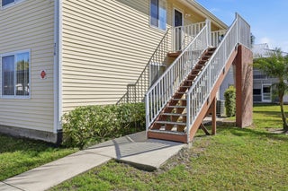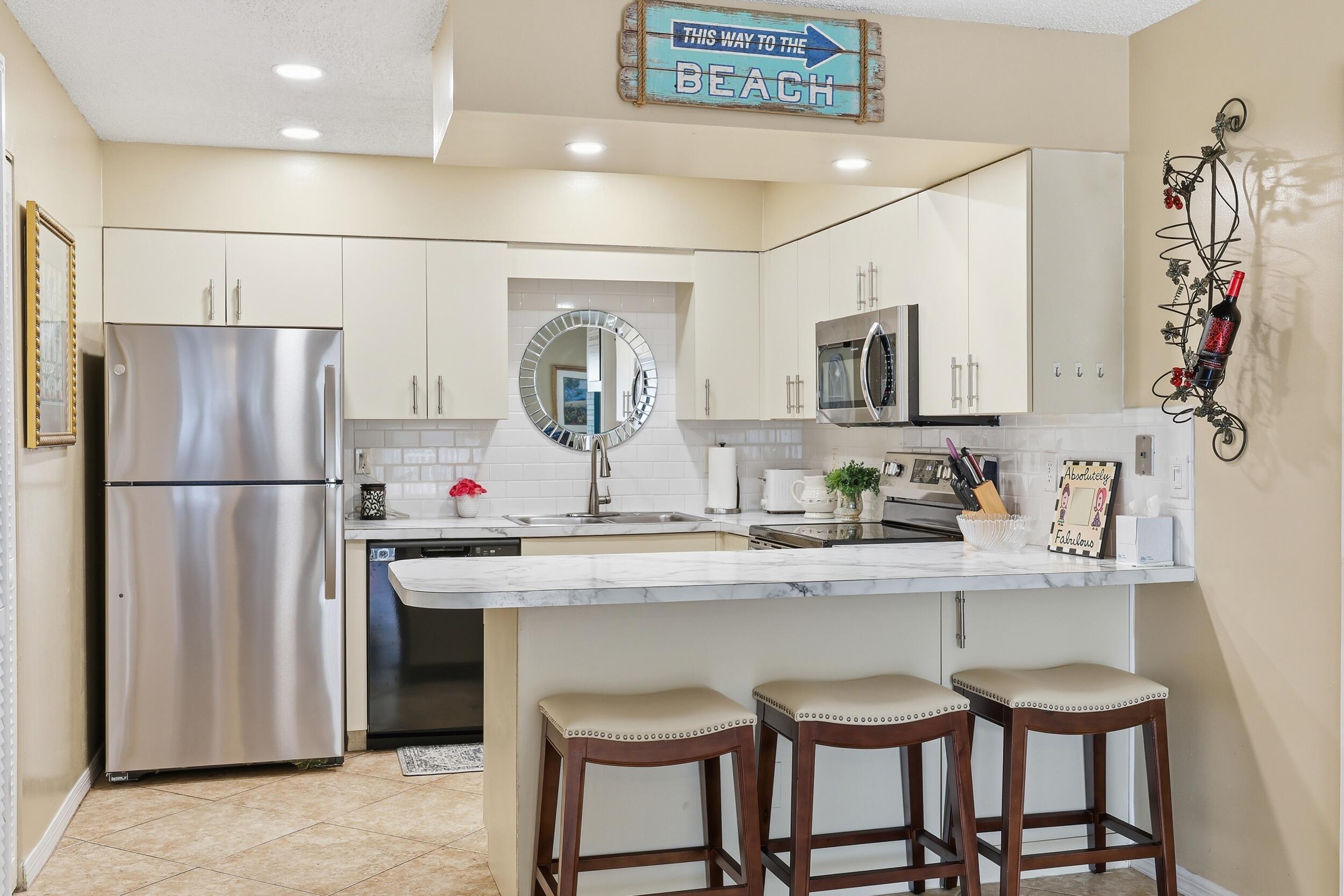 Welcome to this beautifully maintained 3-bedroom, 2-bath corner condo in The Fountains of St. Lucie! Located on the second floor, this light and bright unit offers 1,116 living sq ft with an open-concept layout and vaulted ceilings that create a spacious feel throughout. The updated kitchen features modern cabinetry, stainless steel appliances, and a breakfast bar that flows seamlessly into the oversized 21x21 living and dining area -- perfect for entertaining. Ceramic tile flooring runs throughout the main living spaces for easy maintenance.Additional features include inside laundry, detached covered carport, metal roof, and low monthly HOA fees that include cable, exterior maintenance, roof, insurance, lawn care, pool service, clubhouse, spa, and more. Conveniently located east of US-1 near shopping, dining, beaches, and medical facilities.