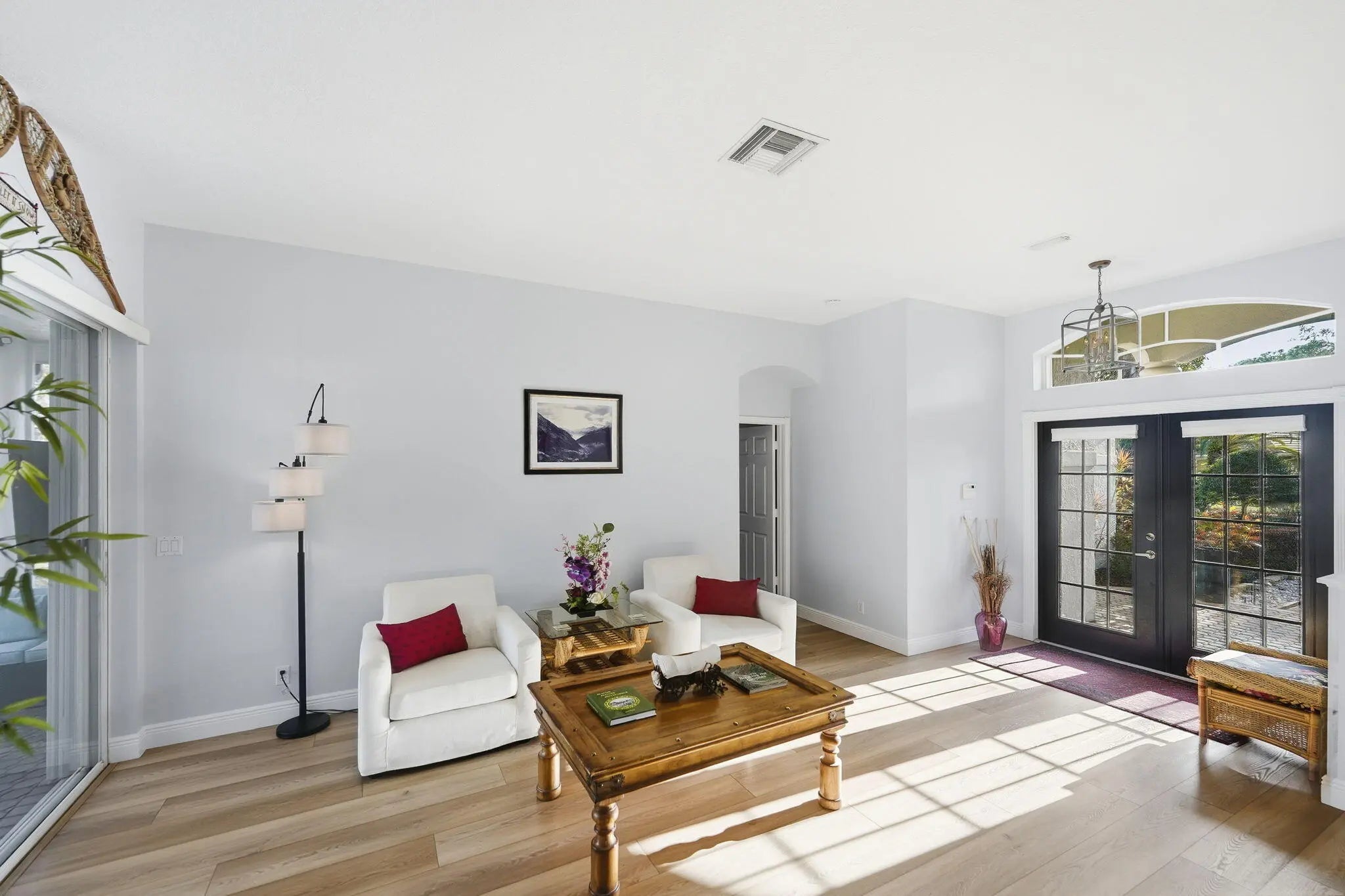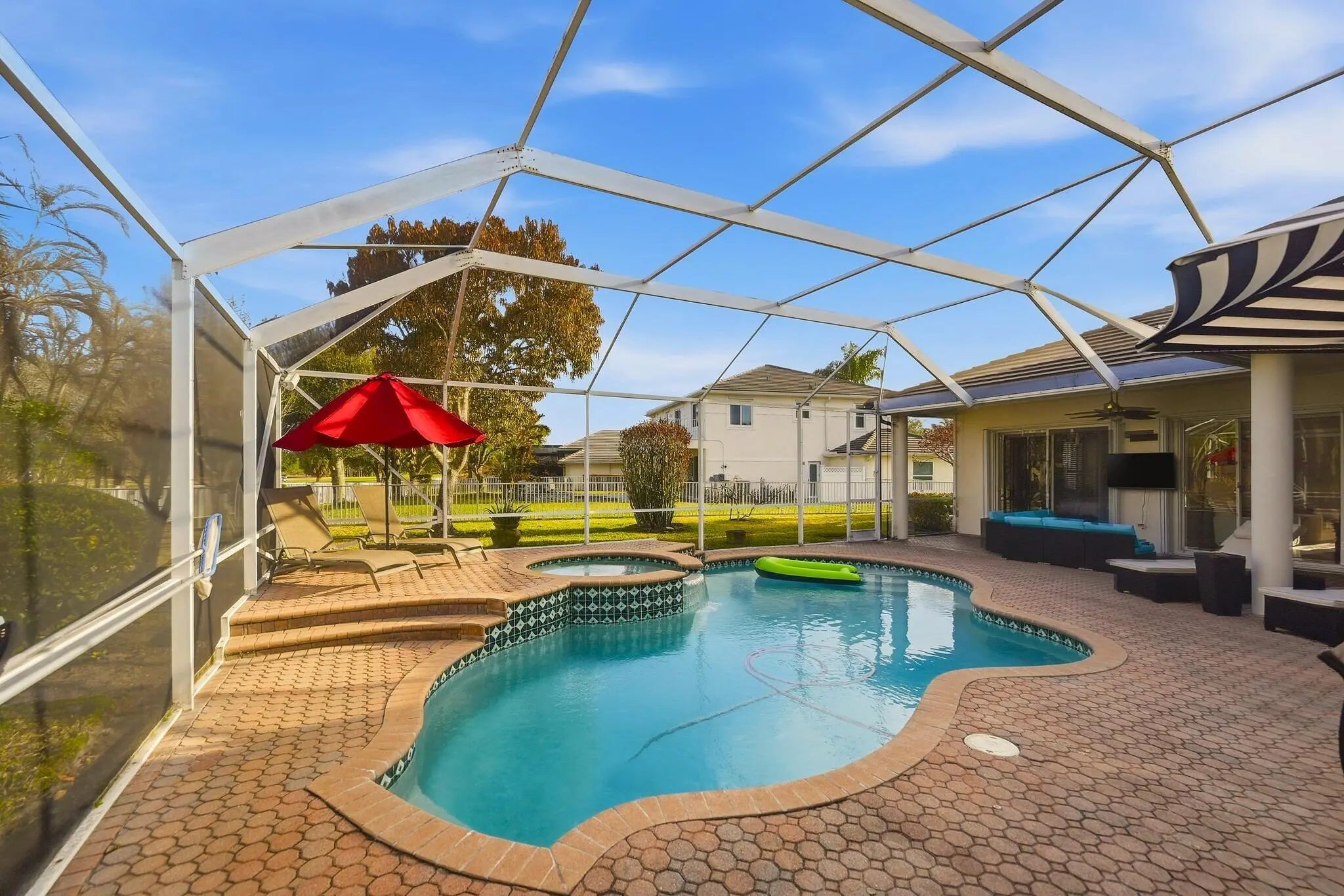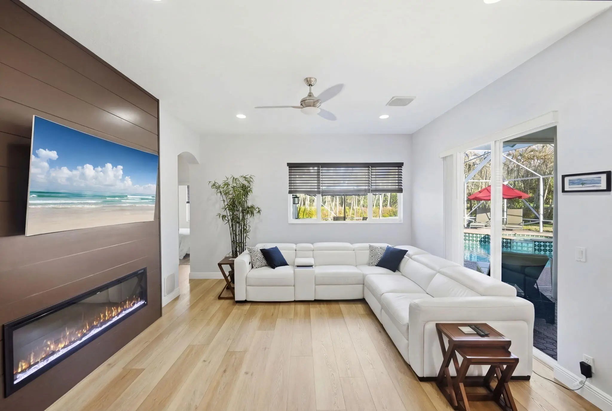 Discover the Sanctuary at Hammock Creek Golf Club in Palm City, this four-bedroom, three-bath, home overlooks the 18th fairway of the Jack Nicklaus-designed course, offering golf views and a sense of openness from both the interior living spaces and the backyard.The property sits on an oversized ~1/3-acre lot with established landscaping and a wide driveway. Outdoor living is fully screened and designed for daily use, featuring a saltwater pool and spa, resurfaced in 2021, with generous covered patio space for dining and entertaining. Inside, the floor plan is functional and balanced, with lots of natural light! You will love the renovated kitchen with quartz counters, white shaker cabinets, tiled backsplash, double ovens, and an open connection to the living room.