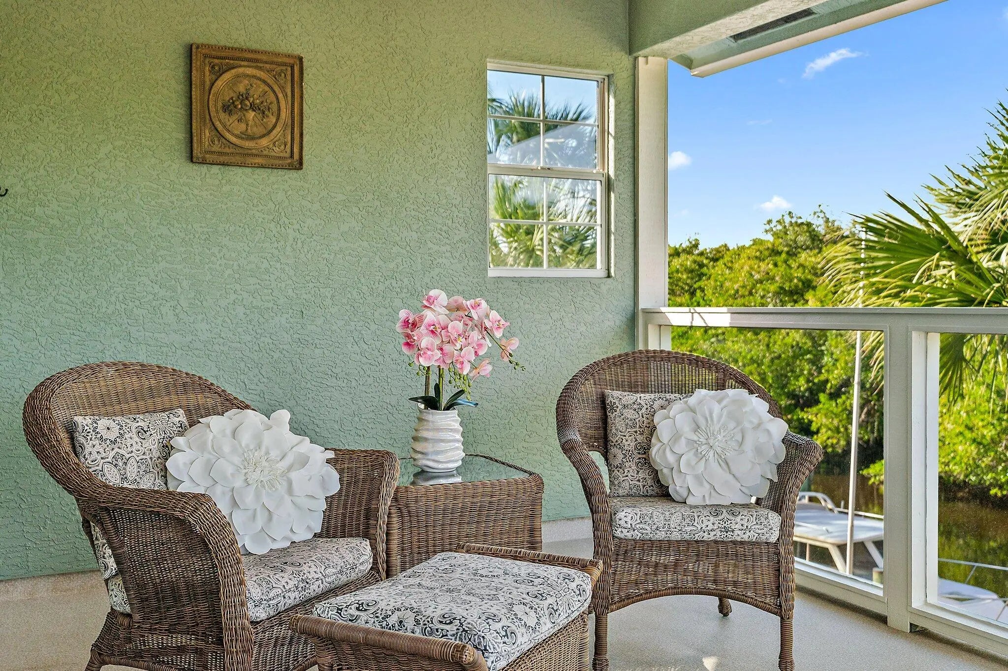 Auto Sprinkler, Awnings, Covered Balcony, Deck, Fruit Tree(s), Open Balcony, Screened Patio, Shutters, Solar Panels, Zoned Sprinkler