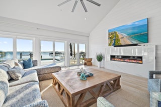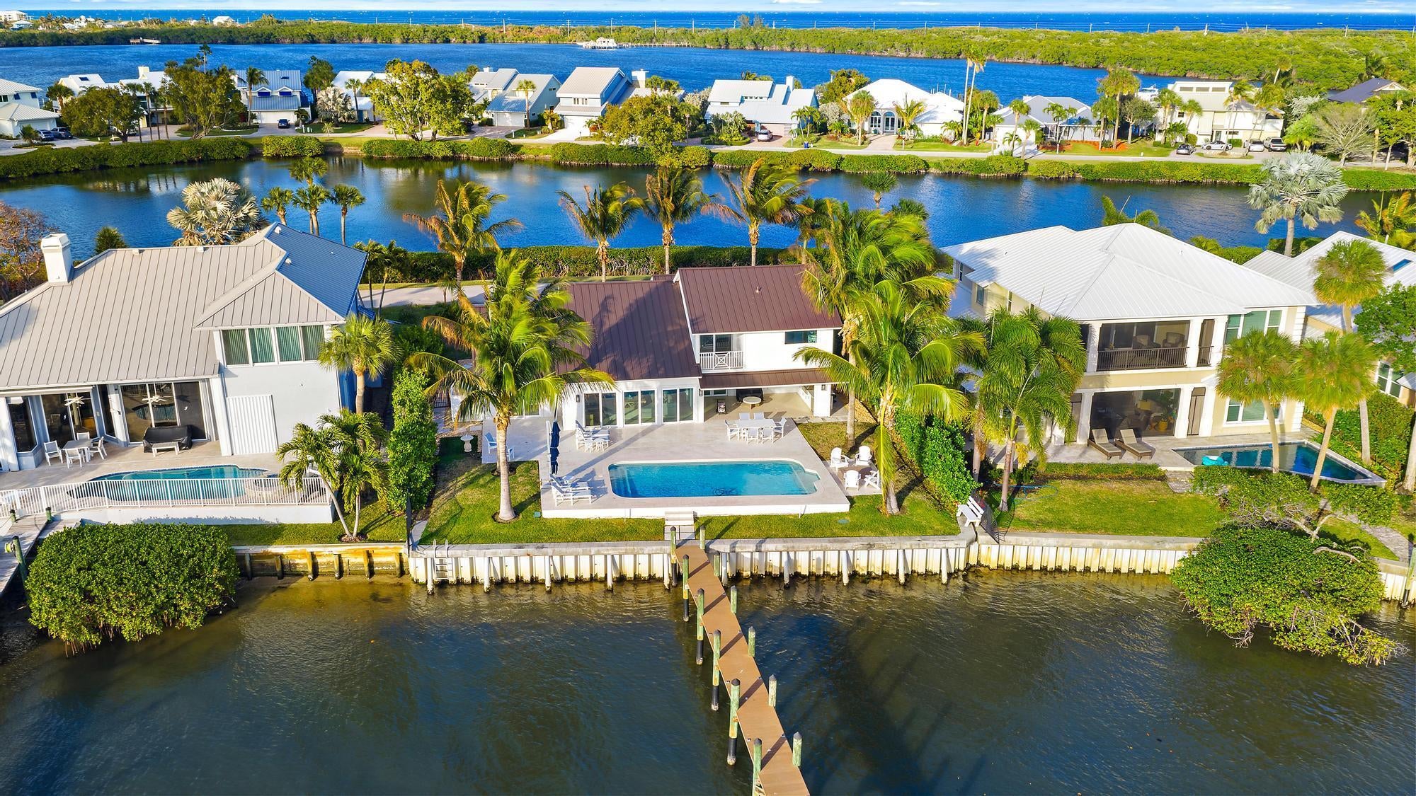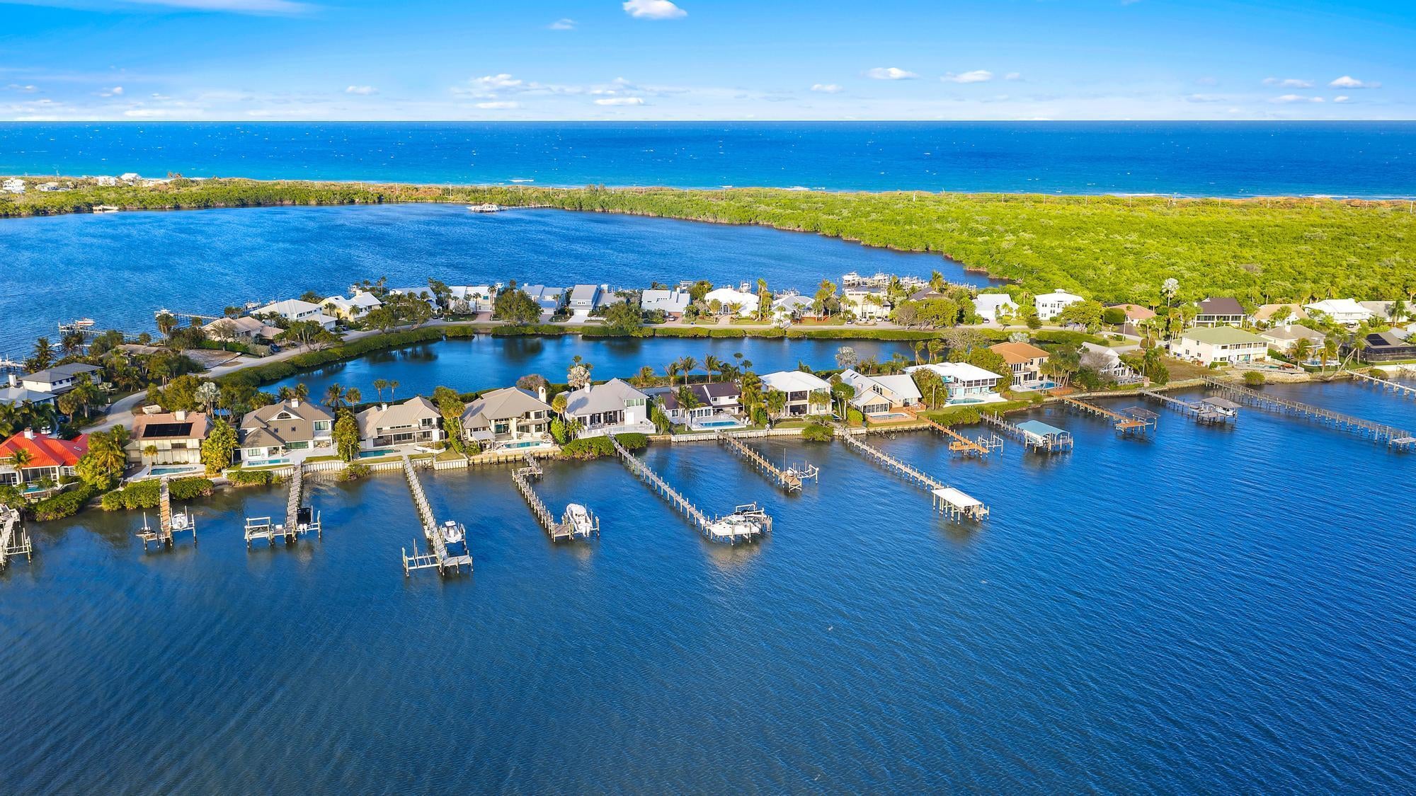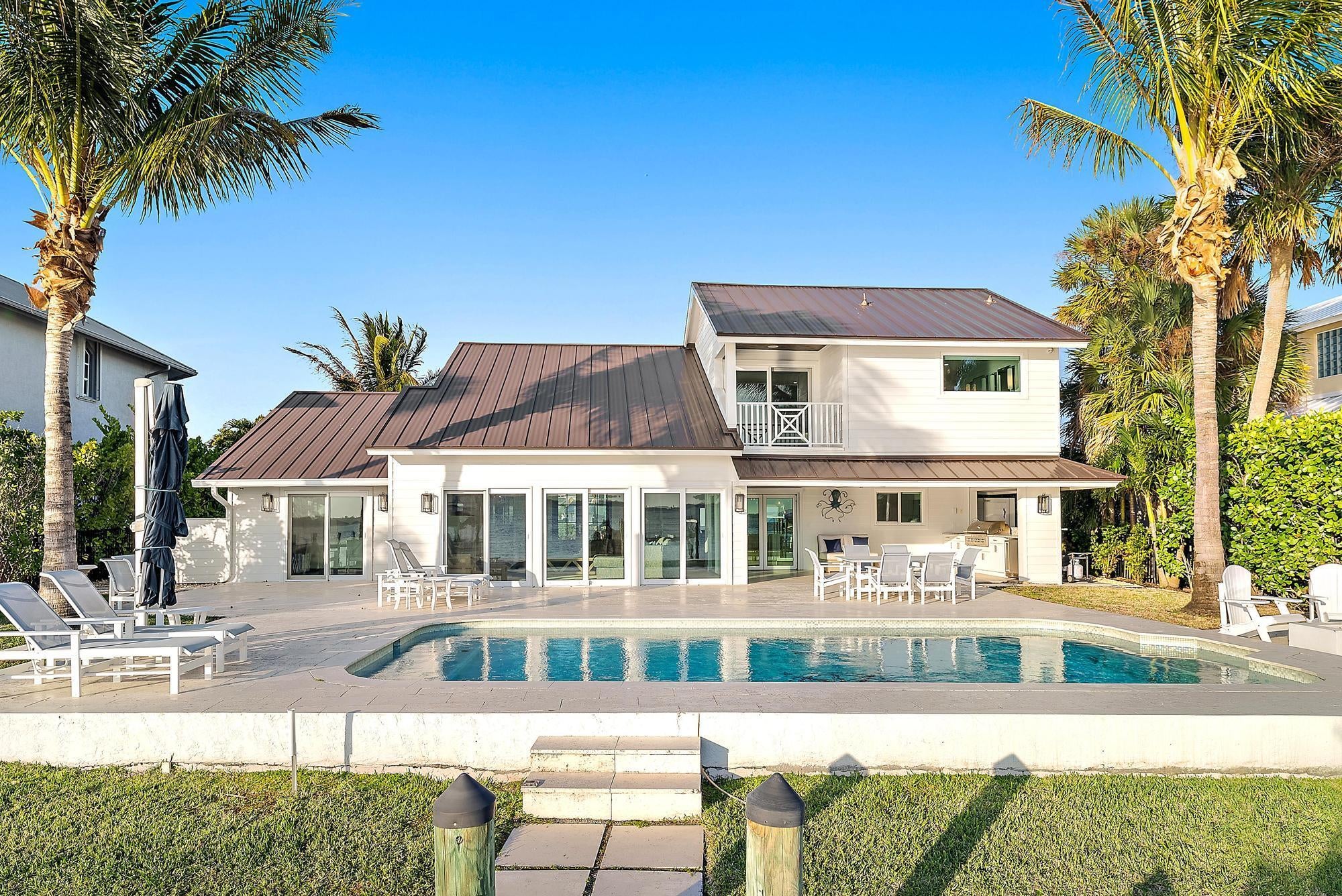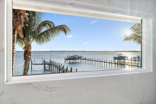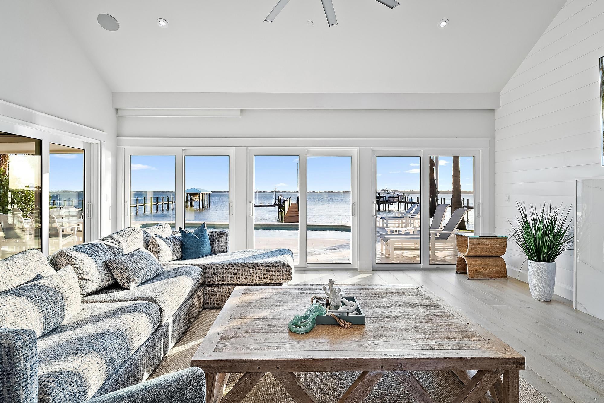 Completely reimagined and rebuilt to the studs in 2021, this exceptional Intracoastal residence in Joe's Point offers panoramic water views and private deeded beach access just steps away. Nearly every room captures sweeping vistas of the water, creating a seamless connection between indoor living and the coastal landscape.Thoughtfully designed with refined coastal finishes, the home showcases reclaimed wide-plank hardwood flooring, shiplap detailing, and a statement fireplace anchoring the great room. The open-concept floor plan flows effortlessly from the living and dining areas--featuring a pecky cypress ceiling--into a chef's kitchen equipped with premium Thermador appliances, custom cabinetry, expansive island seating, dual-fuel double ovens, and a wine cooler, ideal for both dailliving and entertaining. Two guest bedrooms are located on the first floor, while the private upper-level primary suite offers commanding water views, a spa-inspired bath with soaking tub and walk-in shower, dual vanities, and a generous custom closet. Outdoor living is equally impressive, highlighted by a covered lanai with remote-controlled screens, pecky cypress ceiling, summer kitchen with grill and refrigeration, and generous entertaining space. The southwest-facing saltwater pool is framed by natural sandstone decking, complemented by a firepit and outdoor shower. Boaters will appreciate the new seawall, dock, and 16,000-lb lift accommodating up to a 40-foot vessel with approximately 4 feet of draft. Additional features include full impact glass, cement board siding, epoxy garage flooring, fire sprinklers, security with cameras, whole-home automation with Sonos audio, remote shades, propane tank, gas water heater and dryer, updated ductwork, and a new A/C system. Residents of Joe's Point also enjoy access to community tennis courts and their own private beach access. A rare opportunity to experience refined waterfront living with both Intracoastal frontage and deeded Atlantic beach access in one of Stuart's most sought-after gated enclaves.