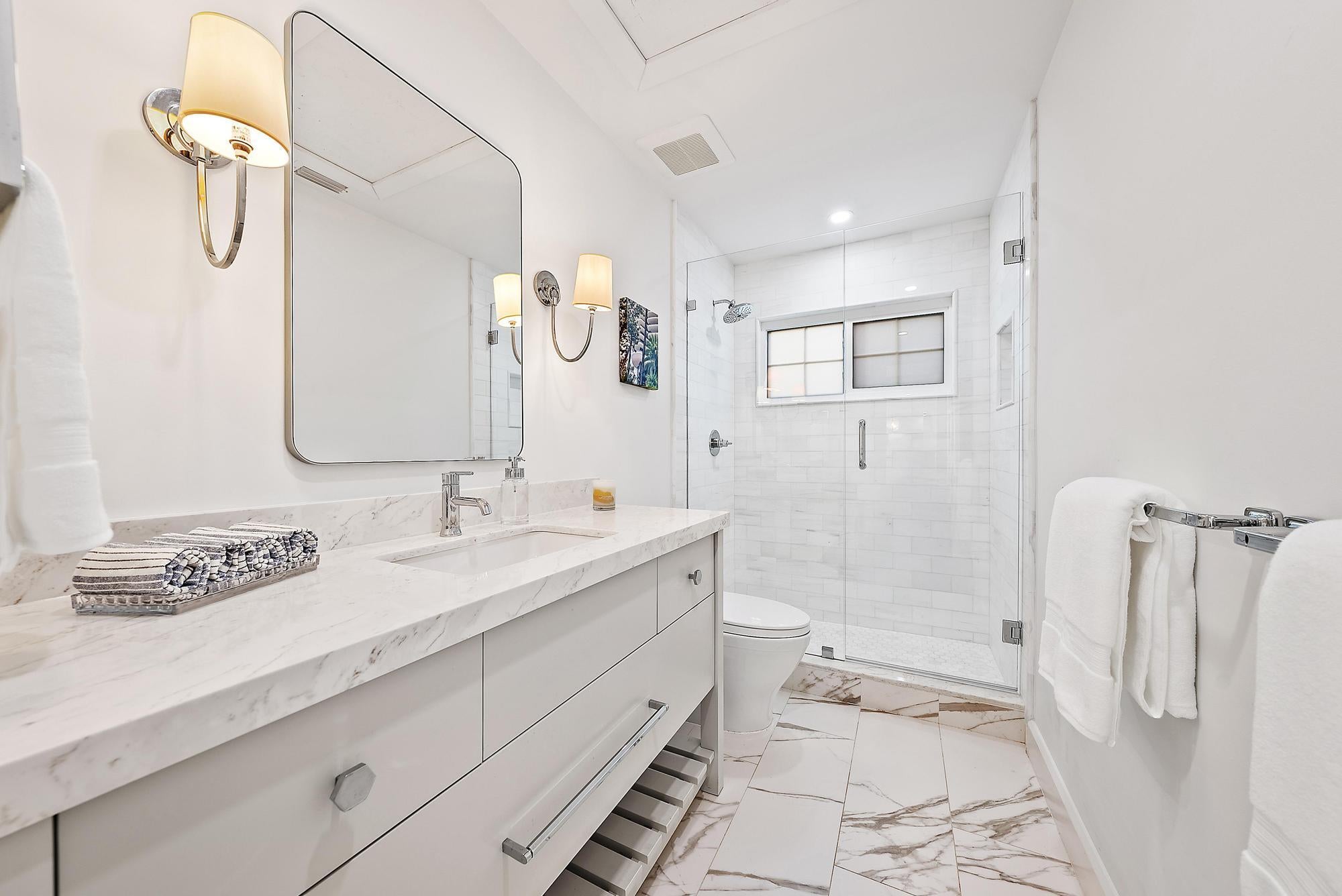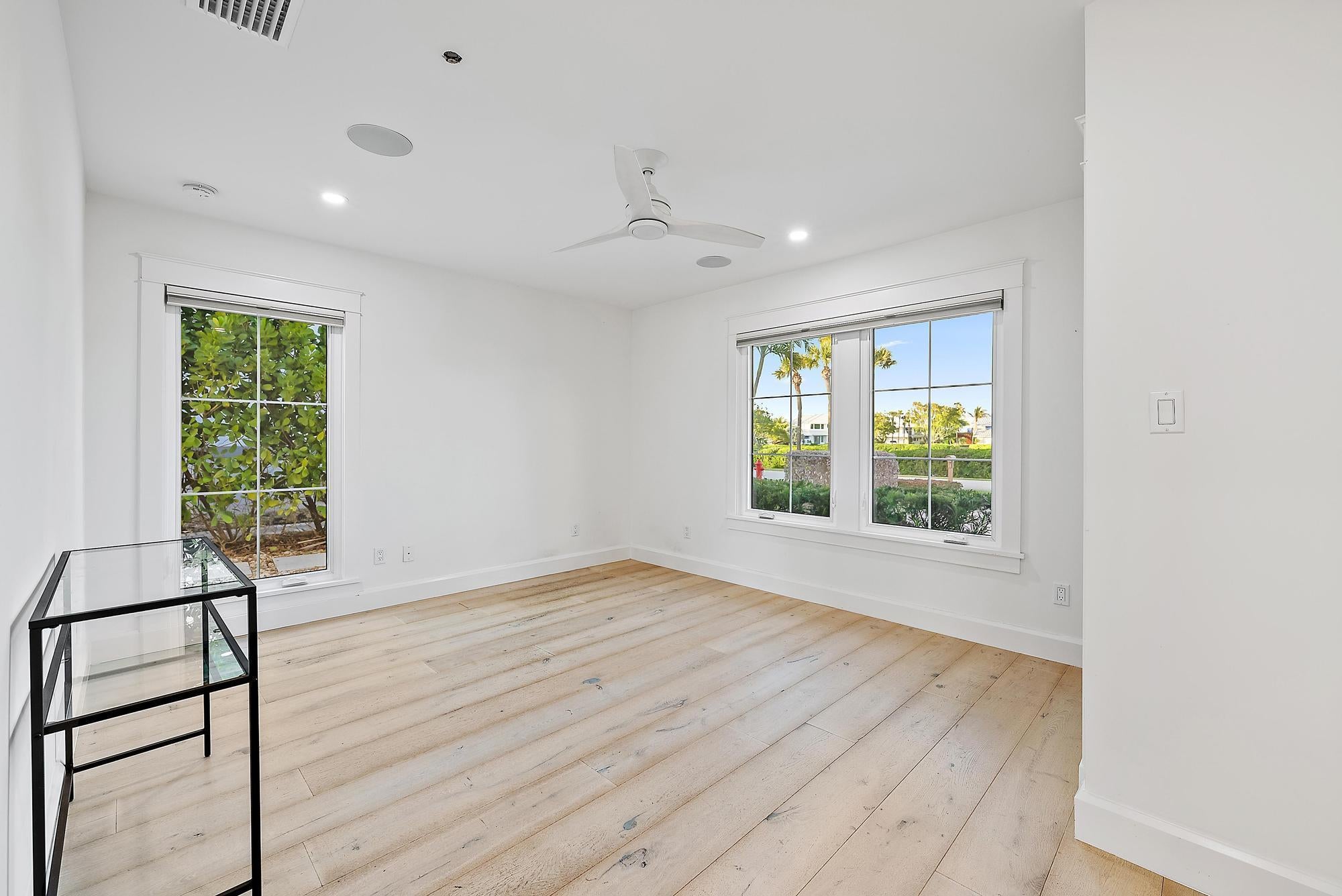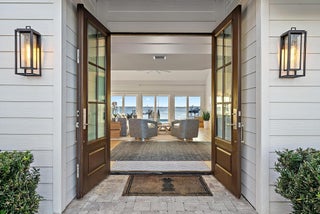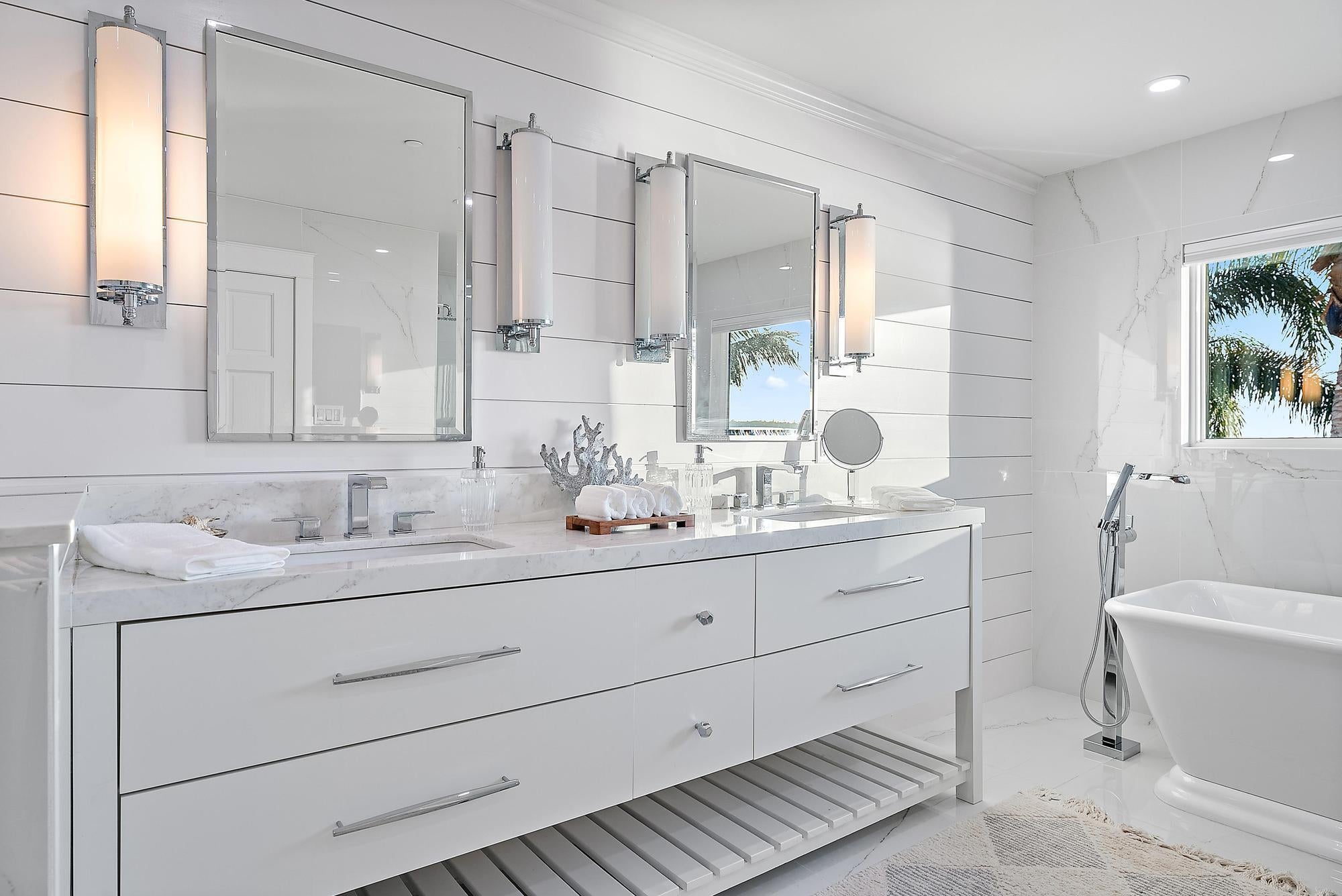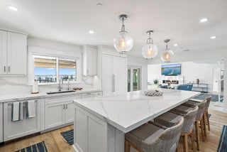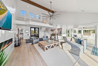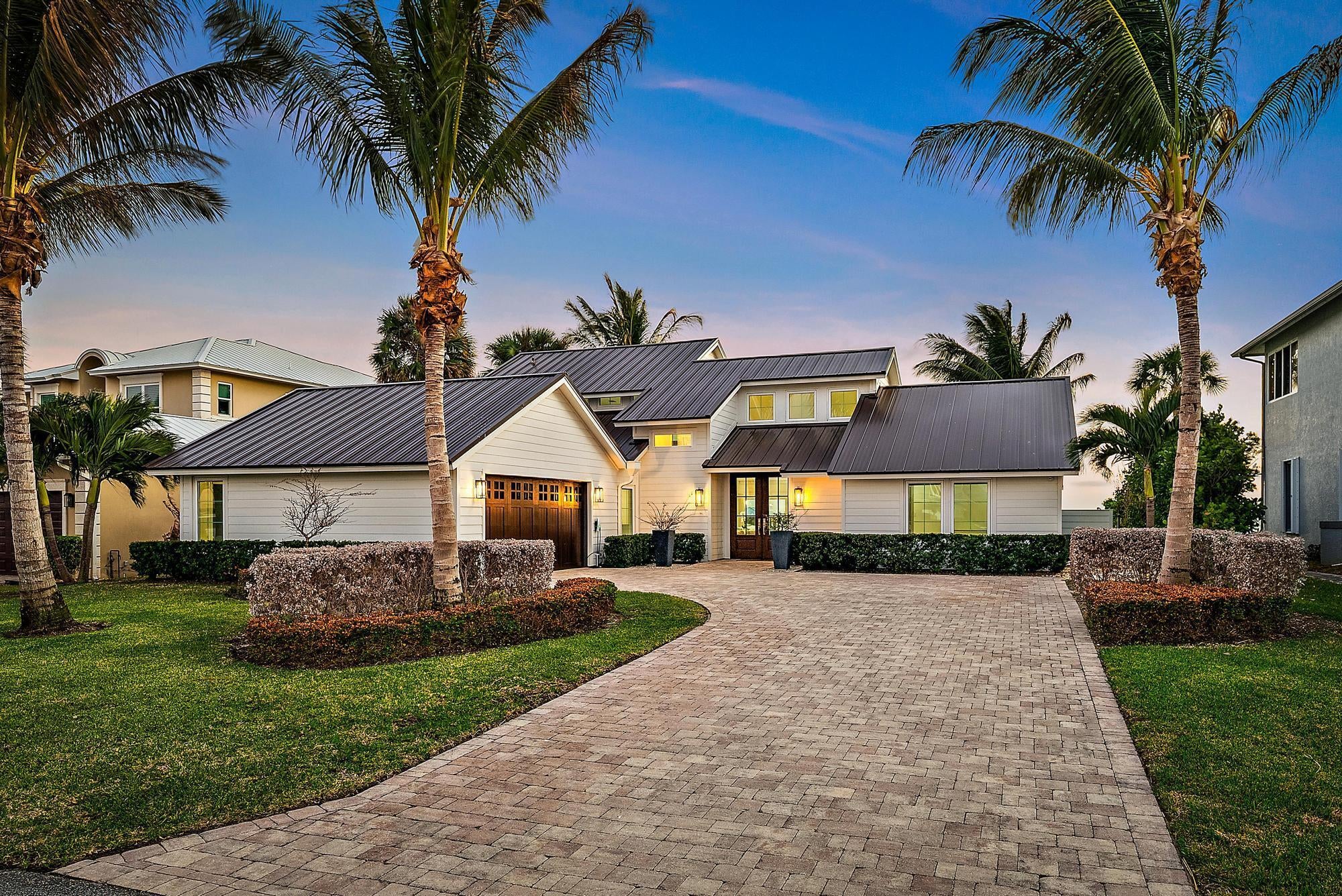 Completely reimagined and rebuilt to the studs in 2021, this exceptional Intracoastal residence in Joe's Point offers panoramic water views and private deeded beach access just steps away. Nearly every room captures sweeping vistas of the water, creating a seamless connection between indoor living and the coastal landscape.Thoughtfully designed with refined coastal finishes, the home showcases reclaimed wide-plank hardwood flooring, shiplap detailing, and a statement fireplace anchoring the great room. The open-concept floor plan flows effortlessly from the living and dining areas--featuring a pecky cypress ceiling--into a chef's kitchen equipped with premium Thermador appliances, custom cabinetry, expansive island seating, dual-fuel double ovens, and a wine cooler, ideal for both dailliving and entertaining. Two guest bedrooms are located on the first floor, while the private upper-level primary suite offers commanding water views, a spa-inspired bath with soaking tub and walk-in shower, dual vanities, and a generous custom closet. Outdoor living is equally impressive, highlighted by a covered lanai with remote-controlled screens, pecky cypress ceiling, summer kitchen with grill and refrigeration, and generous entertaining space. The southwest-facing saltwater pool is framed by natural sandstone decking, complemented by a firepit and outdoor shower. Boaters will appreciate the new seawall, dock, and 16,000-lb lift accommodating up to a 40-foot vessel with approximately 4 feet of draft. Additional features include full impact glass, cement board siding, epoxy garage flooring, fire sprinklers, security with cameras, whole-home automation with Sonos audio, remote shades, propane tank, gas water heater and dryer, updated ductwork, and a new A/C system. Residents of Joe's Point also enjoy access to community tennis courts and their own private beach access. A rare opportunity to experience refined waterfront living with both Intracoastal frontage and deeded Atlantic beach access in one of Stuart's most sought-after gated enclaves.