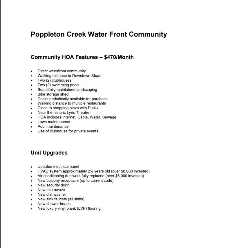Lowest-priced unit in Poppleton Creek at just $158,000! Located in the heart of Stuart, a charming waterfront town known for boating, beaches, and a vibrant historic downtown filled with restaurants, shops, and riverfront events, this updated condo offers exceptional value and lifestyle. Walk or bike to downtown and Publix. The lush, waterfront community features two pools, two clubhouses, kayak/canoe launch, bike storage, and docks that periodically become available. HOA ($470/month) includes internet, cable, water, sewer, lawn care, pool maintenance, and clubhouse use. Interior upgrades include new LVP flooring, updated electrical panel, HVAC (approx. 21/2 years), new microwave and dishwasher, updated fixtures, and new security door. All-ages, pet-friendly, rentals allowed after two years.